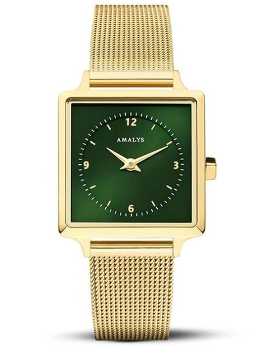 Amalys AMW-136 — женская модель с утончённой минималистичной эстетикой, где квадратный корпус с PVD-покрытиемPVDУльтратонкое покрытие наносится в технике вакуумного напыления, сочетает в себе нитрид титана особой прочности со слоем золота или оксида хрома. Несёт в себе декоративную или защитную функцию. размером 25 мм подчёркивает современный характер и чистоту линий. Механизм — точный кварцевый, обеспечивающий стабильный ход и надёжность в повседневном использовании. Поверхность циферблата оформлена в лаконичном стиле с тонкими метками и стрелками, создающими гармонию и визуальную лёгкость. Защитную функцию выполняет минеральное стеклоМинеральное стеклоМинеральное стекло представляет собой искусственно выращенный минерал кварца. Такое стекло отличается особой устойчивостью к повреждениям и царапинам. Уступает по некоторым качествам сапфировому стеклу., устойчивое к механическим воздействиям и сохраняющее читаемость при ежедневной носке. Браслет с PVD-покрытиемPVDУльтратонкое покрытие наносится в технике вакуумного напыления, сочетает в себе нитрид титана особой прочности со слоем золота или оксида хрома. Несёт в себе декоративную или защитную функцию. выполнен в виде «миланской сетки» шириной 14 мм, оснащён раскладным замкомРаскладной замокДанный вариант застежки используется только на часах с металлическим браслетом. Отличительная особенность такого крепления в том, что длина браслета становится универсальной и вы можете самостоятельно отрегулировать нужный вам размер – застежка просто двигается по браслету часов., его гибкая структура обеспечивает комфортное прилегание к запястью и визуальную утончённость. Единство корпуса и браслета создаёт целостный образ, а изысканная простота дизайна делает модель универсальной — она одинаково уместна и в деловой обстановке, и в повседневных сочетаниях.