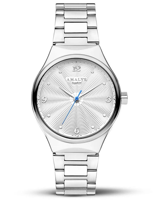 Amalys AMW-156 — женская модель с утончённым современным дизайном, в которой сочетаются минимализм и элегантность. Круглый корпус диаметром 31 мм в серебристом цвете гармонирует с браслетом шириной 16 мм, выполненным из нержавеющей стали и оснащённым раскладным замкомРаскладной замокДанный вариант застежки используется только на часах с металлическим браслетом. Отличительная особенность такого крепления в том, что длина браслета становится универсальной и вы можете самостоятельно отрегулировать нужный вам размер – застежка просто двигается по браслету часов., обеспечивающим удобство и надёжность при носке. Механизм — кварцевый, что гарантирует точный и стабильный ход. Защитную функцию выполняет сапфировое стеклоСапфировое стеклоПрочный и надёжный материал из кристалла сапфира синтетического происхождения, характеризующийся особой твёрдостью и устойчивостью к царапинам и повреждениям., стойкое к царапинам и сохраняющее прозрачность. Водозащита 5 ATM делает модель устойчивой к случайным брызгам и кратковременному контакту с водой. Лаконичный циферблат с декоративным узором и изящными стрелками подчёркивает изысканный характер часов, создавая универсальный образ, подходящий как для повседневных ситуаций, так и для особых случаев.