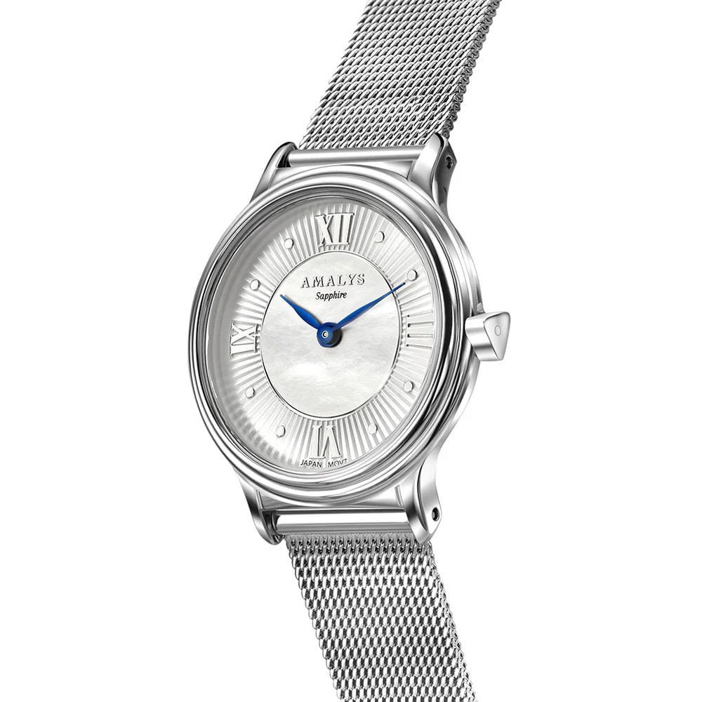 Amalys AMW-197 — женский набор, включающий часы и браслет, выполненный в гармоничном стиле. Круглый корпус диаметром 28 мм изготовлен из нержавеющей стали, а браслет типа «миланская сетка» шириной 14 мм обеспечивает комфортное прилегание и подчёркивает изящный образ. Защитную функцию выполняет сапфировое стеклоСапфировое стеклоПрочный и надёжный материал из кристалла сапфира синтетического происхождения, характеризующийся особой твёрдостью и устойчивостью к царапинам и повреждениям., устойчивое к царапинам и сохраняющее прозрачность. Механизм — кварцевый, надёжный и точный. Браслет снабжён раскладным замкомРаскладной замокДанный вариант застежки используется только на часах с металлическим браслетом. Отличительная особенность такого крепления в том, что длина браслета становится универсальной и вы можете самостоятельно отрегулировать нужный вам размер – застежка просто двигается по браслету часов., что делает ношение удобным и безопасным. Водозащита 5 ATM предохраняет модель от случайных брызг и дождя. Циферблат с римскими индексами и утончённым декоративным узором придаёт часам элегантность, а комплектный браслет завершает цельный и женственный образ.