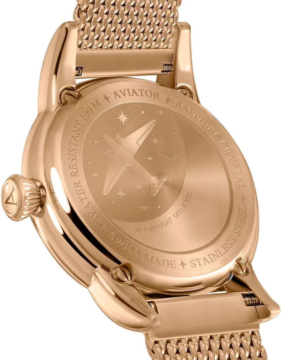 Aviator V.1.33.2.256.5 “Douglas Moonflight” — элегантный дамский швейцарский Moonphase с утончённой авиационной эстетикой. Корпус 36 мм из нержавеющей стали с PVD-покрытиемPVDУльтратонкое покрытие наносится в технике вакуумного напыления, сочетает в себе нитрид титана особой прочности со слоем золота или оксида хрома. Несёт в себе декоративную или защитную функцию. с полированной отделкой обладает компактными пропорциями и удобным литым профилем.