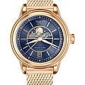 Циферблат в стиле Art Deco украшает усложнение фаз Луны в верхней половине, обрамлённой тонким кольцом облаков. Отмечено окно даты в положении «6 часов». Стрелки и накладные метки обработаны люминесцентным покрытиемЛюминесцентное покрытиеПозволяет считывать показания времени в темноте. Производители наносят на стрелки, часовые индексы, безель или поверхность циферблата светонакопительный состав, дающий холодное свечение. Superluminova — для уверенного считывания в темноте. Поверхность защищена сапфировым стекломСапфировое стеклоПрочный и надёжный материал из кристалла сапфира синтетического происхождения, характеризующийся особой твёрдостью и устойчивостью к царапинам и повреждениям. с антибликовым покрытием.