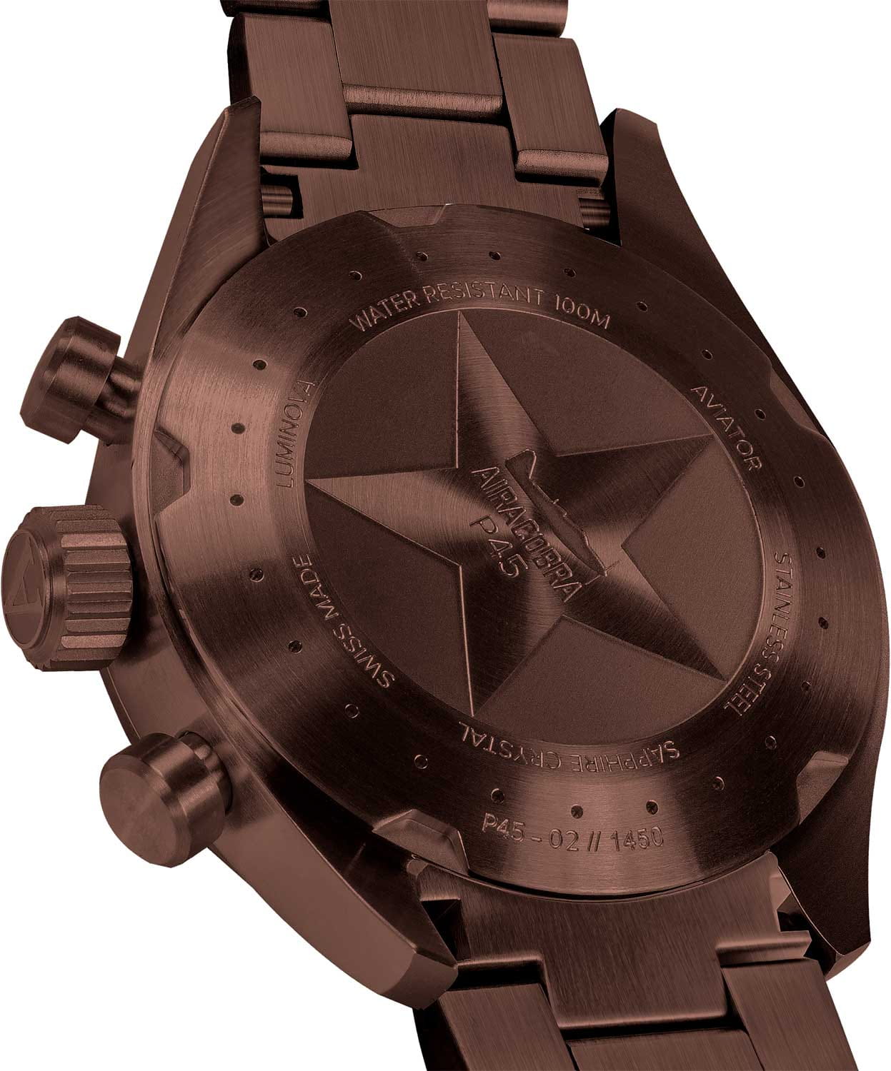 Aviator Airacobra P45 Chrono V.2.25.8.172.5 — швейцарские часы в духе пилотских инструментов, объединяющий точность, удобство и лаконичный дизайн. Диаметр корпуса — 45 мм, выполнен из нержавеющей стали 316L с PVD-покрытиемPVDУльтратонкое покрытие наносится в технике вакуумного напыления, сочетает в себе нитрид титана особой прочности со слоем золота или оксида хрома. Несёт в себе декоративную или защитную функцию., что подчёркивает техническую надёжность в образе часов. Циферблат оформлен в классическом aviator-стиле: крупные арабские цифры, широкие стрелки и чёткое деление минут позволяют считывать время мгновенно. Стрелки и метки покрыты люминесцентным покрытиемЛюминесцентное покрытиеПозволяет считывать показания времени в темноте. Производители наносят на стрелки, часовые индексы, безель или поверхность циферблата светонакопительный состав, дающий холодное свечение. Superluminova для отличной читаемости при слабом освещении. Циферблат защищён стойким сапфировым стекломСапфировое стеклоПрочный и надёжный материал из кристалла сапфира синтетического происхождения, характеризующийся особой твёрдостью и устойчивостью к царапинам и повреждениям. с антибликовым покрытиемАнтибликовое покрытиеСлой оксида металла в 0,13-0,3 микрон, благодаря которому стекло часов не бликует и не отражает свет. Антибликовое покрытие уменьшает отражение света в 10 раз, обеспечивая отличную читаемость показателей циферблата.. У модели присутствуют дата и точный откидной механизм завинчивающейся заводной головки и задней крышки, обеспечивающий надёжную водозащиту до 100 м и защиту от ударов. Внутри установлен швейцарский кварцевый механизм, который обеспечивает функции хронографаХронографФункция позволяет измерять отрезки времени с особой точностью: часы, минуты, секунды. Верным признаком хронографа является наличие на циферблате 3 дополнительных окошек-счётчиков.. Функции добавить (ADD) и разделить (SPLIT). Часы комплектуются браслетом из нержавеющей стали с PVD-покрытиемPVDУльтратонкое покрытие наносится в технике вакуумного напыления, сочетает в себе нитрид титана особой прочности со слоем золота или оксида хрома. Несёт в себе декоративную или защитную функцию. с удобной раскладной застёжкойРаскладная застёжкаТакой тип застёжки используется только на браслетах из металла. Она никогда не раскрывается полностью, происходит разделение на 2 и более частей. Раскладывающая застёжка снизит вероятность потери часов к минимуму., обеспечивающей надёжную фиксацию и комфорт при ежедневной носке. Эти изысканные часы так же обладают функциями тахиметраТахиметрРазмеченная шкала, располагается на ободке или безеле часов. Тахиметр позволяет рассчитать скорость на определённом участке пути, расстояние измеряется в километрах или милях., секундомераСекундомерСекундоме́р — прибор, способный измерять интервалы времени с точностью до долей секунды. и телеметра. Airacobra — это практичный и стильный инструмент для путешествий и активной повседневности, объединяющий авиационную эстетику, точный механизм и удобство.