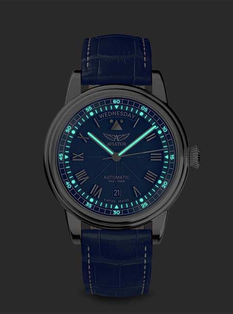 Aviator Douglas Day Date V.3.35.0.276.4 — швейцарские часы в классике авиадизайна, сочетающие безупречную читаемость и высокую надёжность. Лимитированная серия. Корпус диаметром 41,2 мм выполнен из нержавеющей стали 316L. Накладные метки выполнены в виде римских цифр. Окошко даты находится в положении 6 часов. День недели находится в положении 12 часов. Часовые метки и стрелки покрыты люминесцентным покрытиемЛюминесцентное покрытиеПозволяет считывать показания времени в темноте. Производители наносят на стрелки, часовые индексы, безель или поверхность циферблата светонакопительный состав, дающий холодное свечение. Superluminova, позволяющим легко определять время даже в тёмное время суток. Поверхность защищена прочным сапфировым стекломСапфировое стеклоПрочный и надёжный материал из кристалла сапфира синтетического происхождения, характеризующийся особой твёрдостью и устойчивостью к царапинам и повреждениям. с антибликовым покрытием, устойчивым к царапинам. Сердце модели — швейцарский механизм Sellita SW 240-1, известный своей точностью и долговечностью. Водозащита 100 метров, позволит плавать, нырять и заниматься другими водными видами спорта. Завинчивающаяся головка и задняя крышка обеспечивают уверенную ударопрочностьУдаропрочный корпусМеханизм заключён в корпус, выполненный из современных материалов, устойчивых к ударам, механическим повреждениям и падению с высоты: инновационный пластик, карбон, нержавеющая сталь, титан. и надёжную защиту от влаги и пыли. В механизме 26 камней, запас хода до 41 час. Модель дополнена кожаным ремешком с выразительной текстурой и классическим стилем, закреплённым с помощью застёжке-бабочке с кнопкамиЗастёжка "бабочка"Такой вид застёжки дополняется предохранителями, помогающими избежать случайного раскрытия браслета. Обладают изящным исполнением. — для максимального комфорта и лёгкости в повседневном использовании. Модель вдохновлена американским пассажирским самолетом Douglas DC-3, который является одним из лучших самолетов за всю историю авиации. Aviator — это образец лётной точности, инженерной чёткости и сдержанной роскоши, идеально подходящий для тех, кто ценит функциональность и уверенность в каждом элементе.