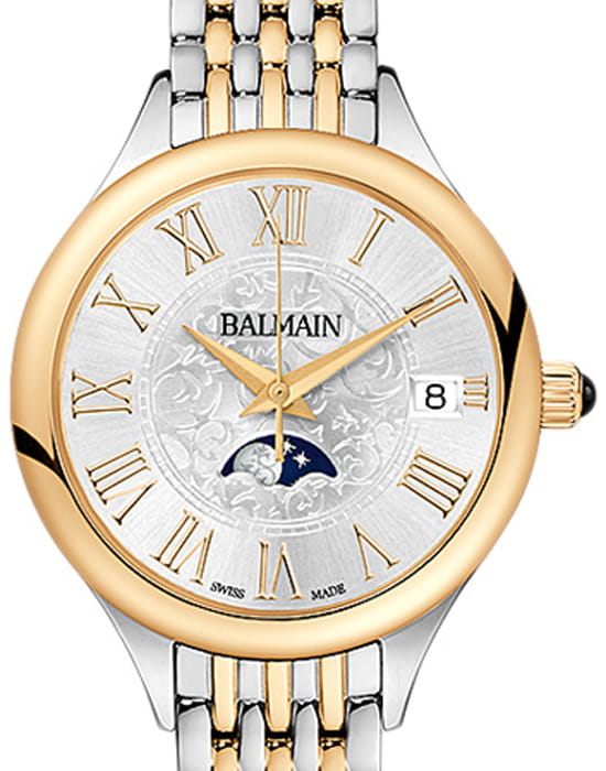 Женские часы Balmain de Balmain B4912.39.12 кварцевый механизм с высокой точностью. Сапфировое стеклоСапфировое стеклоПрочный и надёжный материал из кристалла сапфира синтетического происхождения, характеризующийся особой твёрдостью и устойчивостью к царапинам и повреждениям. устойчивое к появлению царапин, обладающее высокой прозрачностью. Корпус изготовлен из нержавеющей стали. Класс водозащиты: 50 метров, позволит защитить корпус от случайных брызг или капель дождя. Стальной браслет с частичным PVD-покрытиемPVDУльтратонкое покрытие наносится в технике вакуумного напыления, сочетает в себе нитрид титана особой прочности со слоем золота или оксида хрома. Несёт в себе декоративную или защитную функцию.. на застёжке «бабочка» с кнопкамиЗастёжка "бабочка"Такой вид застёжки дополняется предохранителями, помогающими избежать случайного раскрытия браслета. Обладают изящным исполнением. . БезельБезельВнешний ободок, закрепляющий стекло. В спортивных часах так называется поворотное кольцо с делениями на циферблате, выполняет роль таймера – замеряет отрезки времени на шкале. Неподвижный безель – элемент декора. Однонаправленно вращающийся безель на дайверских часах позволяет фиксировать моменты погружения и выныривания на поверхность. с PVD-покрытиемPVDУльтратонкое покрытие наносится в технике вакуумного напыления, сочетает в себе нитрид титана особой прочности со слоем золота или оксида хрома. Несёт в себе декоративную или защитную функцию.. Лунный календарь в позиции 6 часов.