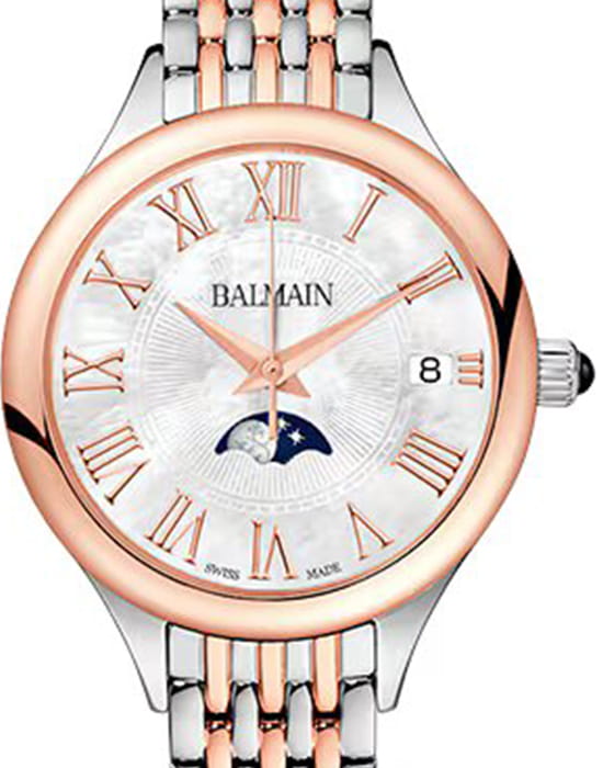 Женские часы Balmain de Balmain B4918.33.82 кварцевый механизм с высокой точностью. Сапфировое стеклоСапфировое стеклоПрочный и надёжный материал из кристалла сапфира синтетического происхождения, характеризующийся особой твёрдостью и устойчивостью к царапинам и повреждениям. устойчивое к появлению царапин, обладающее высокой прозрачностью. Корпус изготовлен из нержавеющей стали. Класс водозащиты: 50 метров, позволит защитить корпус от случайных брызг или капель дождя. Стальной браслет с частичным PVD-покрытиемPVDУльтратонкое покрытие наносится в технике вакуумного напыления, сочетает в себе нитрид титана особой прочности со слоем золота или оксида хрома. Несёт в себе декоративную или защитную функцию.. на застёжке «бабочка» с кнопкамиЗастёжка "бабочка"Такой вид застёжки дополняется предохранителями, помогающими избежать случайного раскрытия браслета. Обладают изящным исполнением. . БезельБезельВнешний ободок, закрепляющий стекло. В спортивных часах так называется поворотное кольцо с делениями на циферблате, выполняет роль таймера – замеряет отрезки времени на шкале. Неподвижный безель – элемент декора. Однонаправленно вращающийся безель на дайверских часах позволяет фиксировать моменты погружения и выныривания на поверхность. с PVD-покрытиемPVDУльтратонкое покрытие наносится в технике вакуумного напыления, сочетает в себе нитрид титана особой прочности со слоем золота или оксида хрома. Несёт в себе декоративную или защитную функцию.. Лунный календарь в позиции 6 часов.