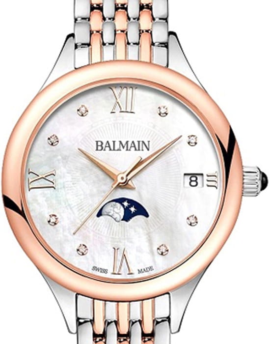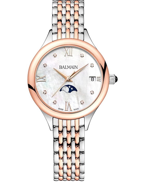 Женские часы Balmain de Balmain B4918.33.85 кварцевый механизм с высокой точностью. Сапфировое стеклоСапфировое стеклоПрочный и надёжный материал из кристалла сапфира синтетического происхождения, характеризующийся особой твёрдостью и устойчивостью к царапинам и повреждениям. устойчивое к появлению царапин, обладающее высокой прозрачностью. Корпус изготовлен из нержавеющей стали. Класс водозащиты: 50 метров, позволит защитить корпус от случайных брызг или капель дождя. Стальной браслет с частичным PVD-покрытиемPVDУльтратонкое покрытие наносится в технике вакуумного напыления, сочетает в себе нитрид титана особой прочности со слоем золота или оксида хрома. Несёт в себе декоративную или защитную функцию.. на застёжке «бабочка» с кнопкамиЗастёжка "бабочка"Такой вид застёжки дополняется предохранителями, помогающими избежать случайного раскрытия браслета. Обладают изящным исполнением. . БезельБезельВнешний ободок, закрепляющий стекло. В спортивных часах так называется поворотное кольцо с делениями на циферблате, выполняет роль таймера – замеряет отрезки времени на шкале. Неподвижный безель – элемент декора. Однонаправленно вращающийся безель на дайверских часах позволяет фиксировать моменты погружения и выныривания на поверхность. с PVD-покрытиемPVDУльтратонкое покрытие наносится в технике вакуумного напыления, сочетает в себе нитрид титана особой прочности со слоем золота или оксида хрома. Несёт в себе декоративную или защитную функцию.. Лунный календарь в позиции 6 часов.