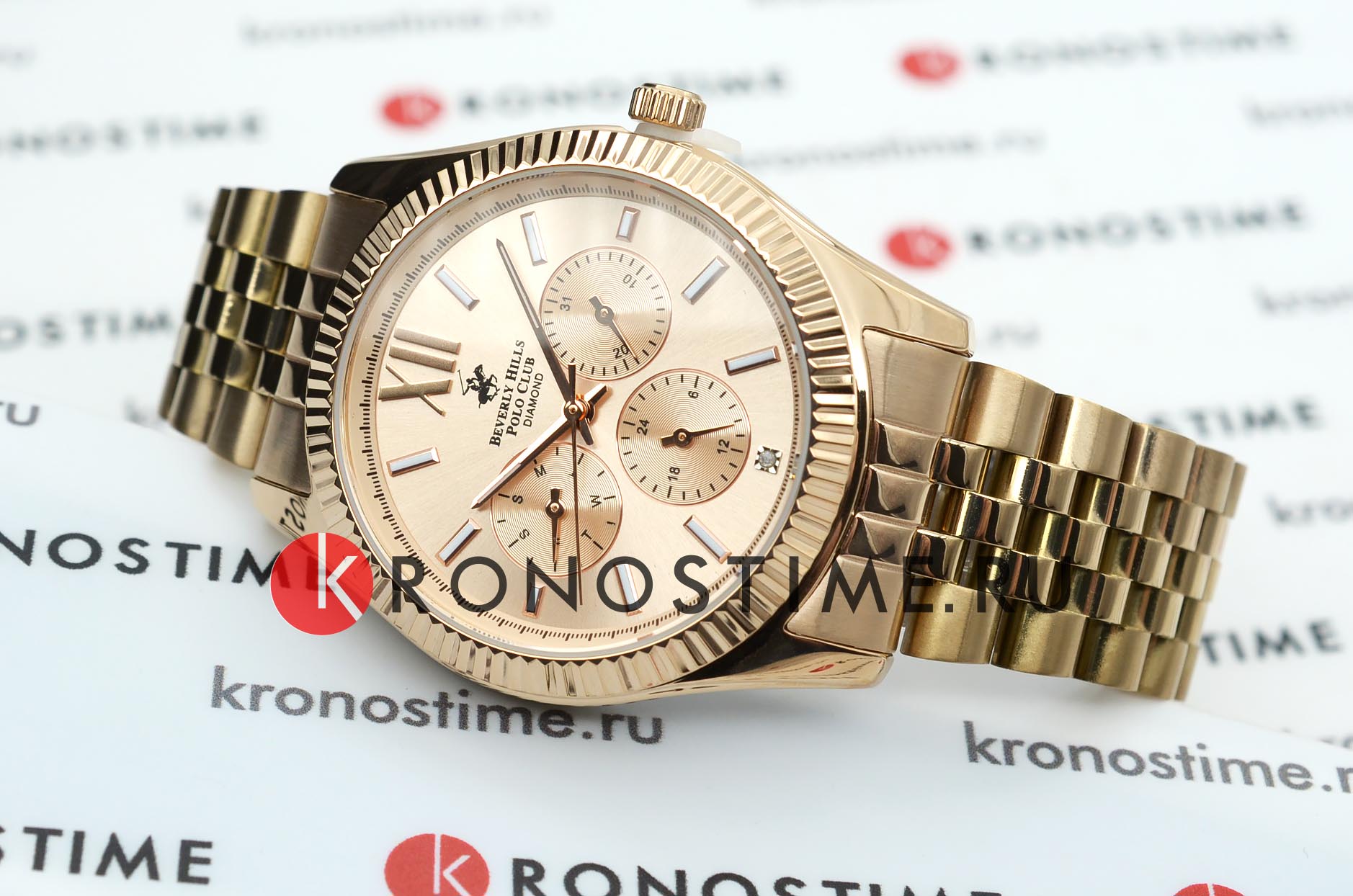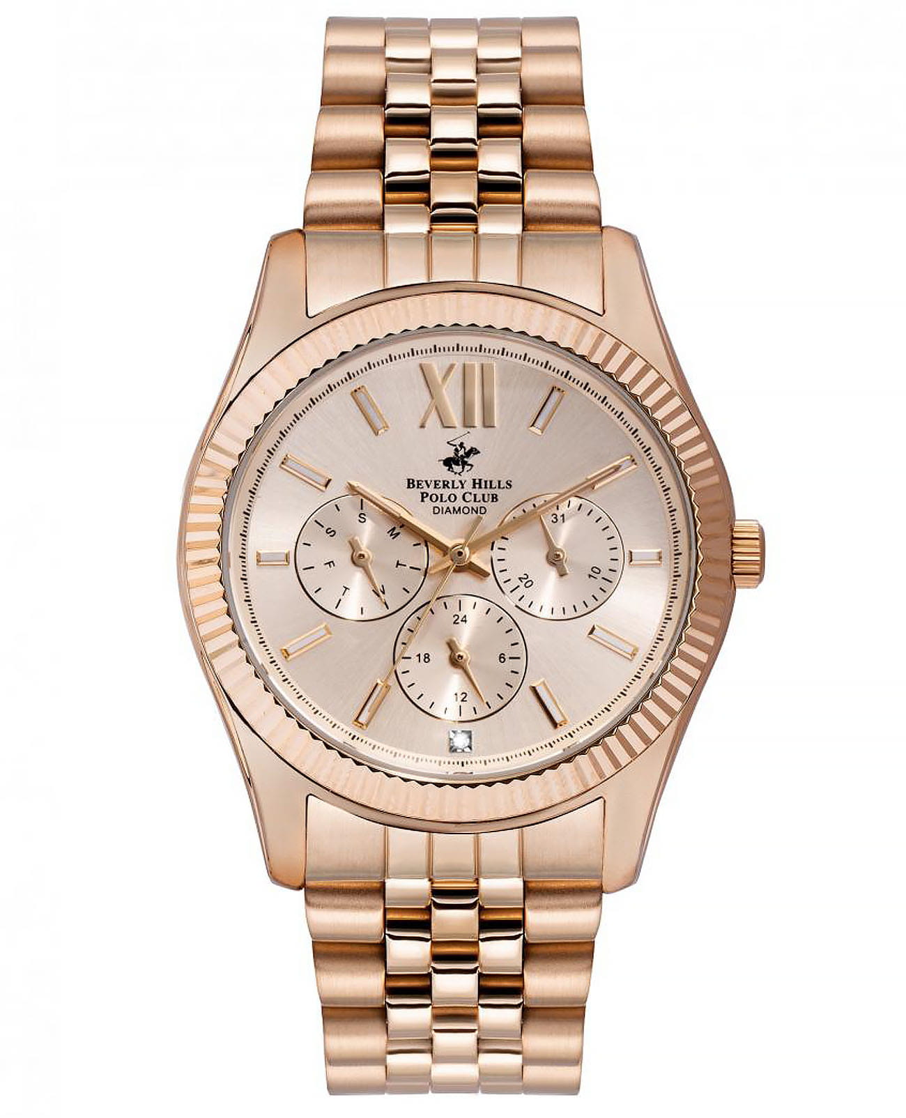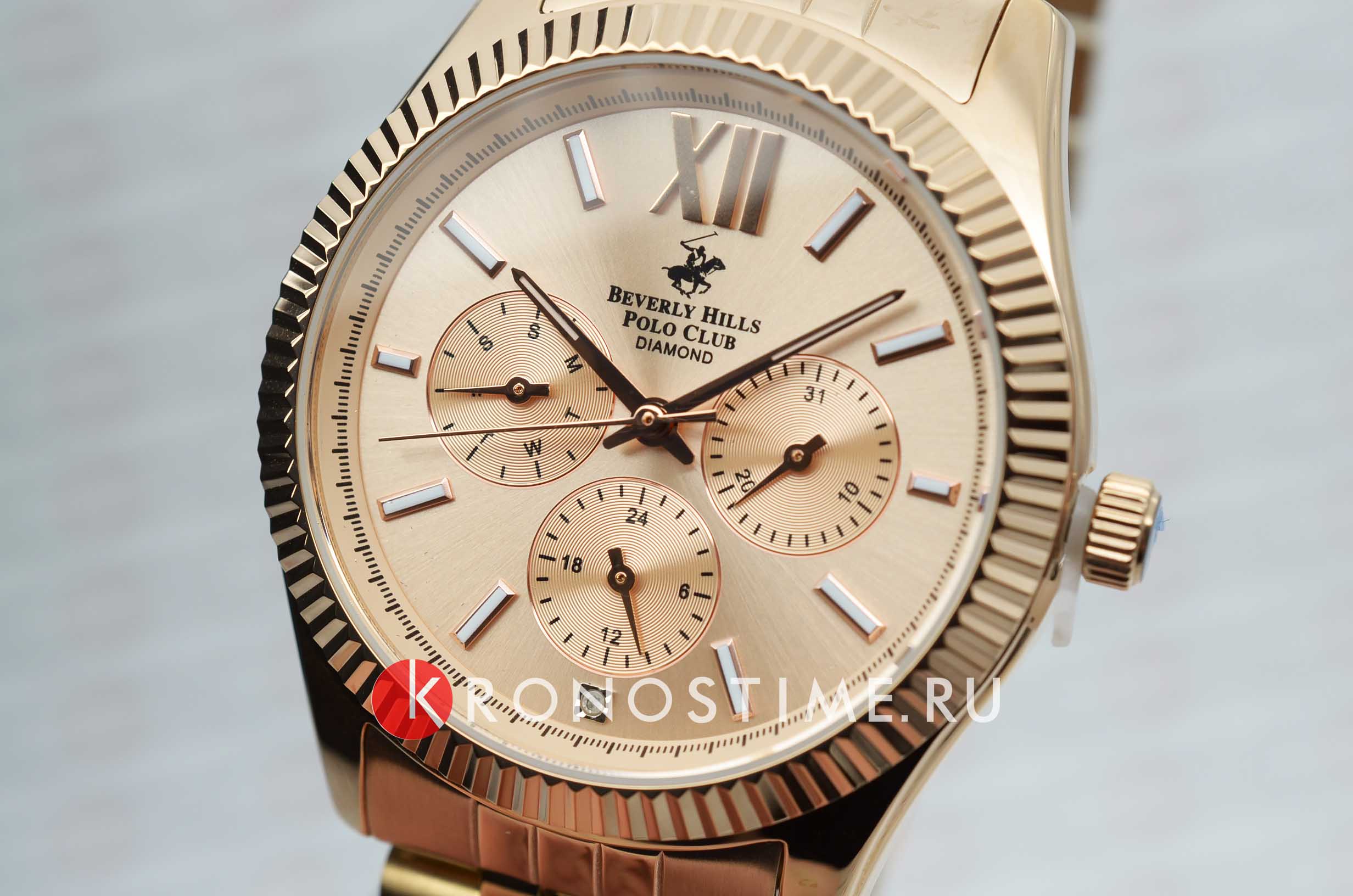 Американские женские часы с бриллиантом Beverly Hills Polo Club BP3082C.410, кварцевый механизм с высокой точностью. Класс водозащиты: 50 метров, позволит защитить корпус от случайных брызг или капель дождя. Циферблат украшен бриллиантом. Корпус часов изготовлен из стали с IP-покрытиемIP-покрытиеМетод ионного напыления. Демонстрирует повышенную устойчивость к истиранию, окислению и химическим веществам. Под воздействием высокого давления и температуры около 1500°C молекулы металла надёжно соединяются с частицами корпуса часов. цвета розовое золото. Застёжка бабочка с кнопкамиЗастёжка "бабочка"Такой вид застёжки дополняется предохранителями, помогающими избежать случайного раскрытия браслета. Обладают изящным исполнением. .