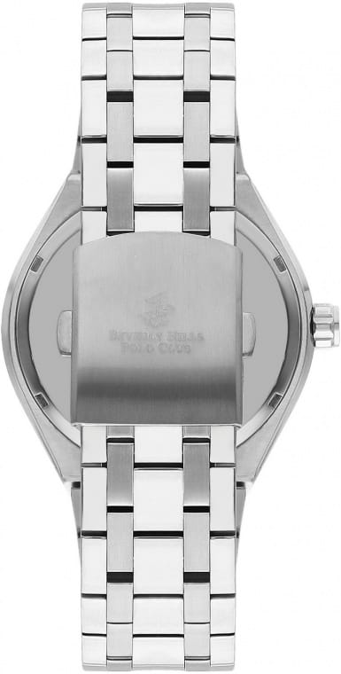 Американские мужские часы Beverly Hills Polo Club BP3404X.370 с минеральным стекломМинеральное стеклоМинеральное стекло представляет собой искусственно выращенный минерал кварца. Такое стекло отличается особой устойчивостью к повреждениям и царапинам. Уступает по некоторым качествам сапфировому стеклу., кварцевый механизм с высокой точностью. Класс водозащиты: 100 метров, позволит защитить корпус от случайных брызг или капель дождя. Корпус часов изготовлен из стали. Стальной браслет с раскладной застёжкойРаскладная застёжкаТакой тип застёжки используется только на браслетах из металла. Она никогда не раскрывается полностью, происходит разделение на 2 и более частей. Раскладывающая застёжка снизит вероятность потери часов к минимуму.. Стрелки и метки с люминесцентным покрытиемЛюминесцентное покрытиеПозволяет считывать показания времени в темноте. Производители наносят на стрелки, часовые индексы, безель или поверхность циферблата светонакопительный состав, дающий холодное свечение.. Окошко даты находится в положении 3 часа. БезельБезельВнешний ободок, закрепляющий стекло. В спортивных часах так называется поворотное кольцо с делениями на циферблате, выполняет роль таймера – замеряет отрезки времени на шкале. Неподвижный безель – элемент декора. Однонаправленно вращающийся безель на дайверских часах позволяет фиксировать моменты погружения и выныривания на поверхность. с PVD-покрытиемPVDУльтратонкое покрытие наносится в технике вакуумного напыления, сочетает в себе нитрид титана особой прочности со слоем золота или оксида хрома. Несёт в себе декоративную или защитную функцию..