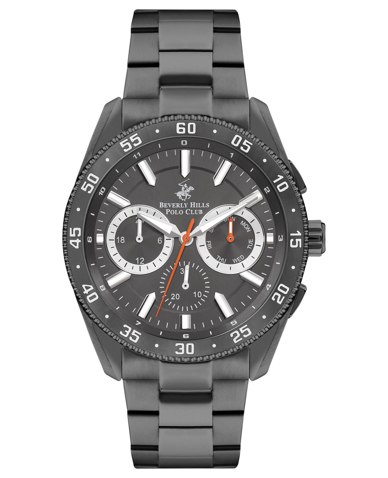Американские мужские часы Beverly Hills Polo Club BP3409X.060 с минеральным стекломМинеральное стеклоМинеральное стекло представляет собой искусственно выращенный минерал кварца. Такое стекло отличается особой устойчивостью к повреждениям и царапинам. Уступает по некоторым качествам сапфировому стеклу., кварцевый механизм с высокой точностью. Корпус и браслет часов изготовлен из нержавеющей стали с IP-покрытиемIP-покрытиеМетод ионного напыления. Демонстрирует повышенную устойчивость к истиранию, окислению и химическим веществам. Под воздействием высокого давления и температуры около 1500°C молекулы металла надёжно соединяются с частицами корпуса часов.. Неподвижный безельБезельВнешний ободок, закрепляющий стекло. В спортивных часах так называется поворотное кольцо с делениями на циферблате, выполняет роль таймера – замеряет отрезки времени на шкале. Неподвижный безель – элемент декора. Однонаправленно вращающийся безель на дайверских часах позволяет фиксировать моменты погружения и выныривания на поверхность. из нержавеющей стали с IP-покрытиемIP-покрытиеМетод ионного напыления. Демонстрирует повышенную устойчивость к истиранию, окислению и химическим веществам. Под воздействием высокого давления и температуры около 1500°C молекулы металла надёжно соединяются с частицами корпуса часов.. Стрелки с люминесцентной подсветкойЛюминесцентное покрытиеПозволяет считывать показания времени в темноте. Производители наносят на стрелки, часовые индексы, безель или поверхность циферблата светонакопительный состав, дающий холодное свечение.. На циферблате расположены три дополнительных индикатора. Класс водозащиты: 100 метров, позволит плавать, нырять и заниматься другими водными видами спорта. Стальной браслет на раскладной застёжкеРаскладная застёжкаТакой тип застёжки используется только на браслетах из металла. Она никогда не раскрывается полностью, происходит разделение на 2 и более частей. Раскладывающая застёжка снизит вероятность потери часов к минимуму..