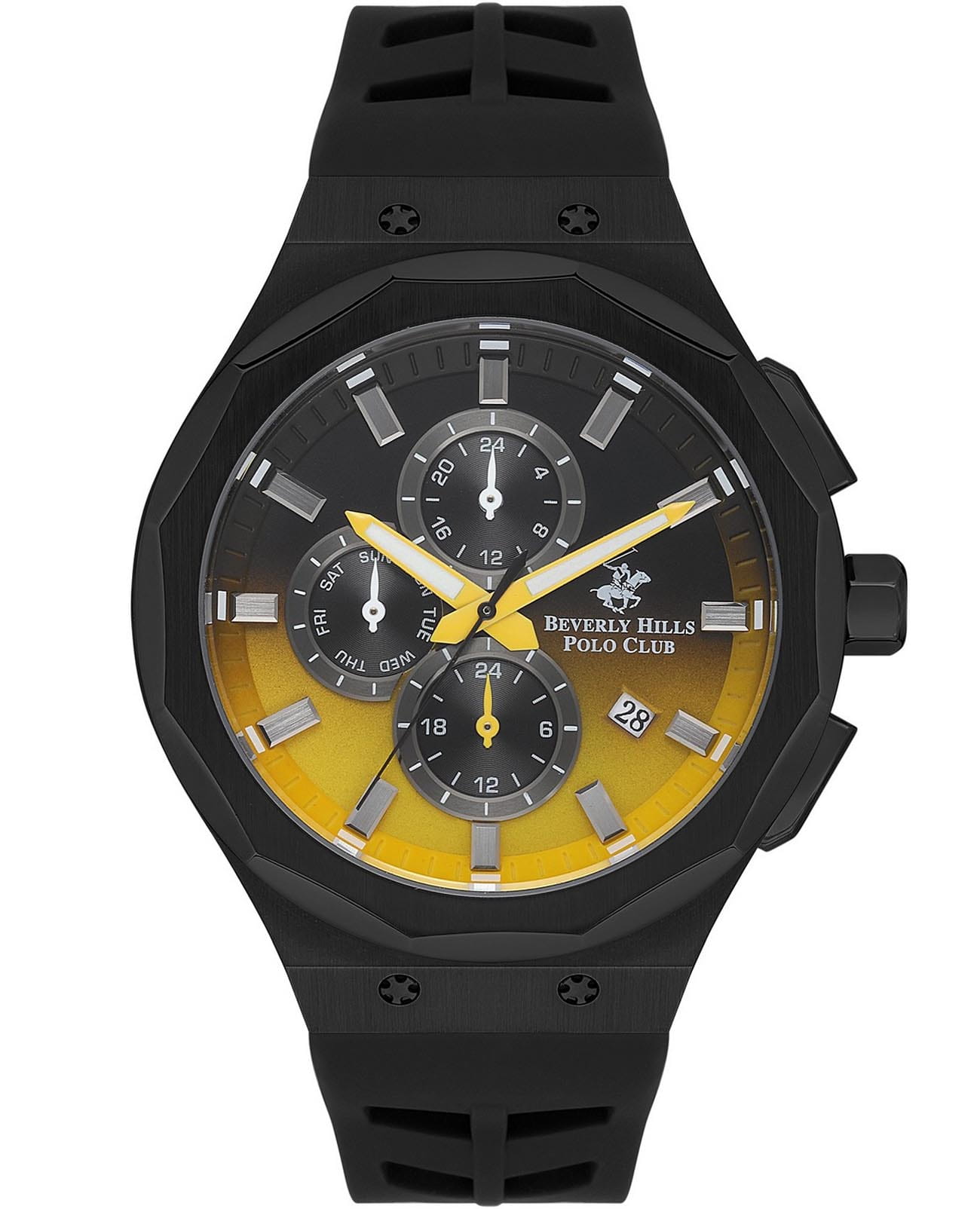 Американские мужские часы Beverly Hills Polo Club BP3535X.601 с минеральным стекломМинеральное стеклоМинеральное стекло представляет собой искусственно выращенный минерал кварца. Такое стекло отличается особой устойчивостью к повреждениям и царапинам. Уступает по некоторым качествам сапфировому стеклу.. Кварцевый механизм высокой точности. Корпус часов изготовлен из нержавеющей стали с IP-покрытиемIP-покрытиеМетод ионного напыления. Демонстрирует повышенную устойчивость к истиранию, окислению и химическим веществам. Под воздействием высокого давления и температуры около 1500°C молекулы металла надёжно соединяются с частицами корпуса часов.. Стрелки и метки с люминесцентным покрытиемЛюминесцентное покрытиеПозволяет считывать показания времени в темноте. Производители наносят на стрелки, часовые индексы, безель или поверхность циферблата светонакопительный состав, дающий холодное свечение.. Окошко даты находится в положении 4 часа. Каучуковый ремешок на стандартной застёжке. Класс водозащиты: 50 метров, позволит защитить корпус от случайных брызг или капель дождя. День недели, 24-х часовой формат времени и второй часовой поясВторой часовой поясФункция, позволяющая отображать время двух часовых поясов одновременно. отображены на дополнительных циферблатах.