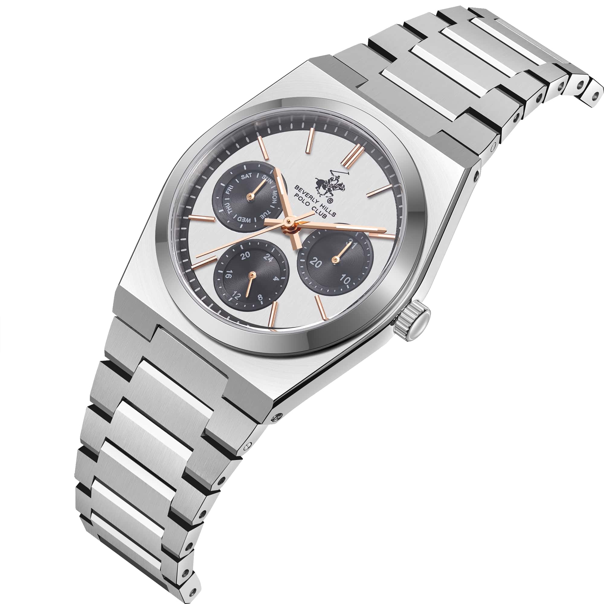 Beverly Hills Polo Club BP3754X.330 – элегантные женские часы, сочетающие стильный дизайн и высокую функциональность. Корпус диаметром 33 мм выполнен из стали, обеспечивающего прочность и долговечность. Циферблат украшен, и защищён минеральным стекломМинеральное стеклоМинеральное стекло представляет собой искусственно выращенный минерал кварца. Такое стекло отличается особой устойчивостью к повреждениям и царапинам. Уступает по некоторым качествам сапфировому стеклу., устойчивым к царапинам. Часы оснащены точным кварцевым механизмом, гарантирующим надёжное отображение времени. Браслет из нержавеющей стали на застёжке-бабочке с кнопкамиЗастёжка "бабочка"Такой вид застёжки дополняется предохранителями, помогающими избежать случайного раскрытия браслета. Обладают изящным исполнением. , обеспечивающей комфортное ношение и надёжную фиксацию на запястье. Водозащита до 50 метров (5 ATM) позволяет использовать часы в повседневной жизни, включая кратковременное погружение в воду.