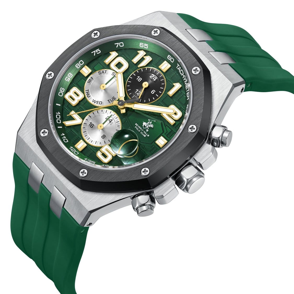 Американские мужские часы Beverly Hills Polo Club BP3783X.377 - это стильный мужской аксессуар, который сочетает элегантный дизайн и практичность. Корпус выполнен из нержавеющей стали серебристого цвета, диаметром 42 мм, что обеспечивает долговечность и утончённый внешний вид. Надежное минеральное стеклоМинеральное стеклоМинеральное стекло представляет собой искусственно выращенный минерал кварца. Такое стекло отличается особой устойчивостью к повреждениям и царапинам. Уступает по некоторым качествам сапфировому стеклу. с сапфировым покрытием защищает циферблат от царапин и обеспечивает долговечность. Модель оснащена кварцевым механизмом, обеспечивающим высокую точность хода. Неподвижный безельБезельВнешний ободок, закрепляющий стекло. В спортивных часах так называется поворотное кольцо с делениями на циферблате, выполняет роль таймера – замеряет отрезки времени на шкале. Неподвижный безель – элемент декора. Однонаправленно вращающийся безель на дайверских часах позволяет фиксировать моменты погружения и выныривания на поверхность. с IP-покрытиемIP-покрытиеМетод ионного напыления. Демонстрирует повышенную устойчивость к истиранию, окислению и химическим веществам. Под воздействием высокого давления и температуры около 1500°C молекулы металла надёжно соединяются с частицами корпуса часов. черного цвета. Каучуковый ремешок на стандартной застежке обеспечивает комфортное ношение. Функциональность модели расширена за счёт индикации даты, дня недели, дополнительным 24-х часовым индикатором и тахиметраТахиметрРазмеченная шкала, располагается на ободке или безеле часов. Тахиметр позволяет рассчитать скорость на определённом участке пути, расстояние измеряется в километрах или милях.. Стрелки и метки с люминесцентным покрытиемЛюминесцентное покрытиеПозволяет считывать показания времени в темноте. Производители наносят на стрелки, часовые индексы, безель или поверхность циферблата светонакопительный состав, дающий холодное свечение. позволяют легко считывать время даже в условиях недостаточного освещения. Водозащита 50 метров позволит защитить корпус от случайных брызг или капель дождя. Эта модель – отличный выбор для тех, кто ищет сочетание стиля, качества и функциональности. Часы станут не только полезным аксессуаром, но и выразительным элементом вашего имиджа.