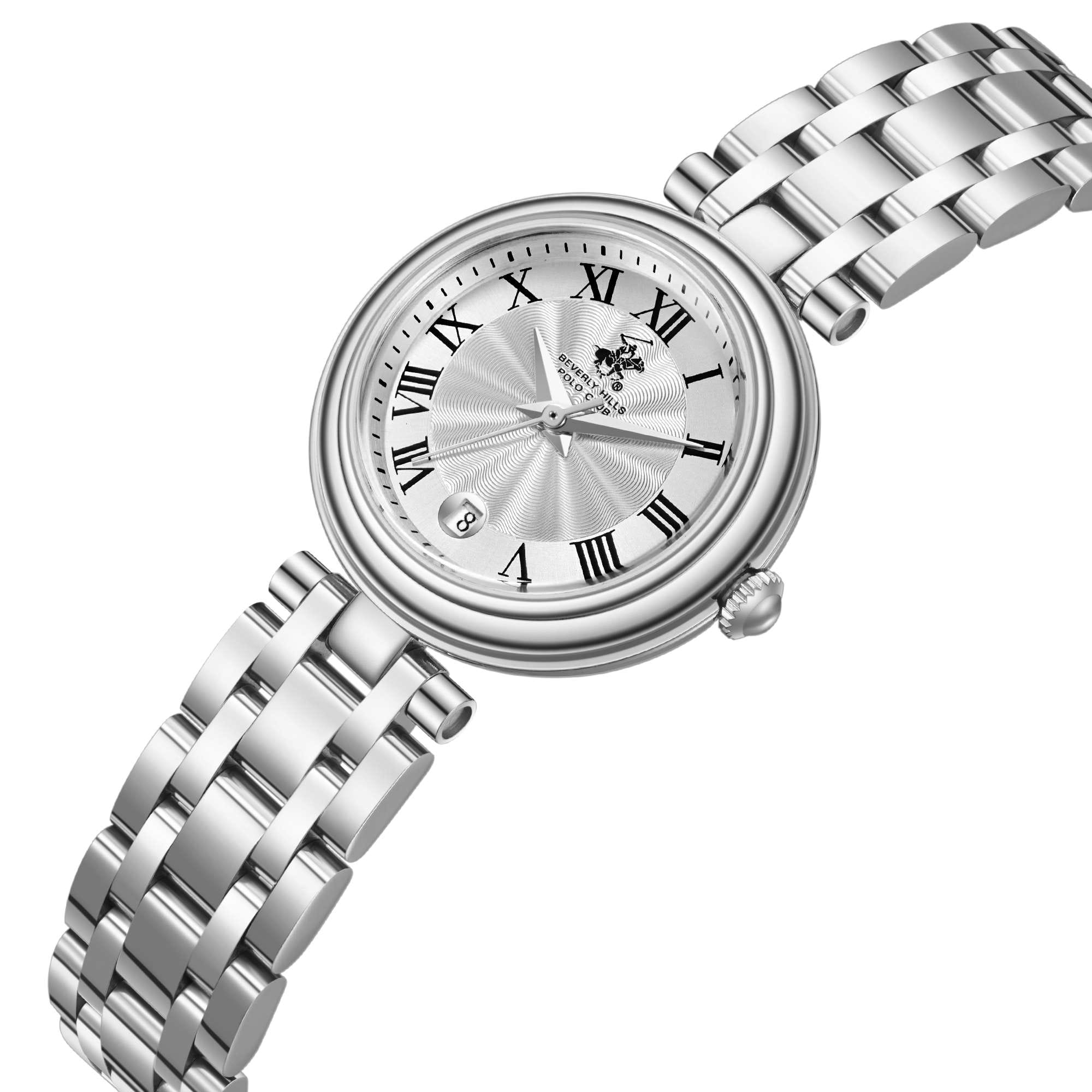 Женские кварцевые часы Beverly Hills Polo Club — это элегантный аксессуар. Корпус диаметром 26 мм выполнен из нержавеющей стали. Циферблат оформлен индексами и стрелками. Окошко даты расположено в положении 6 часов. Циферблат защищён минеральным стекломМинеральное стеклоМинеральное стекло представляет собой искусственно выращенный минерал кварца. Такое стекло отличается особой устойчивостью к повреждениям и царапинам. Уступает по некоторым качествам сапфировому стеклу.. Часы оснащены стальным браслетом на застёжке «бабочка» с кнопкамиЗастёжка "бабочка"Такой вид застёжки дополняется предохранителями, помогающими избежать случайного раскрытия браслета. Обладают изящным исполнением. . Водонепроницаемость 30 м позволяет использовать часы в повседневных условиях. Идеальный выбор для тех, кто ценит стиль и качество.