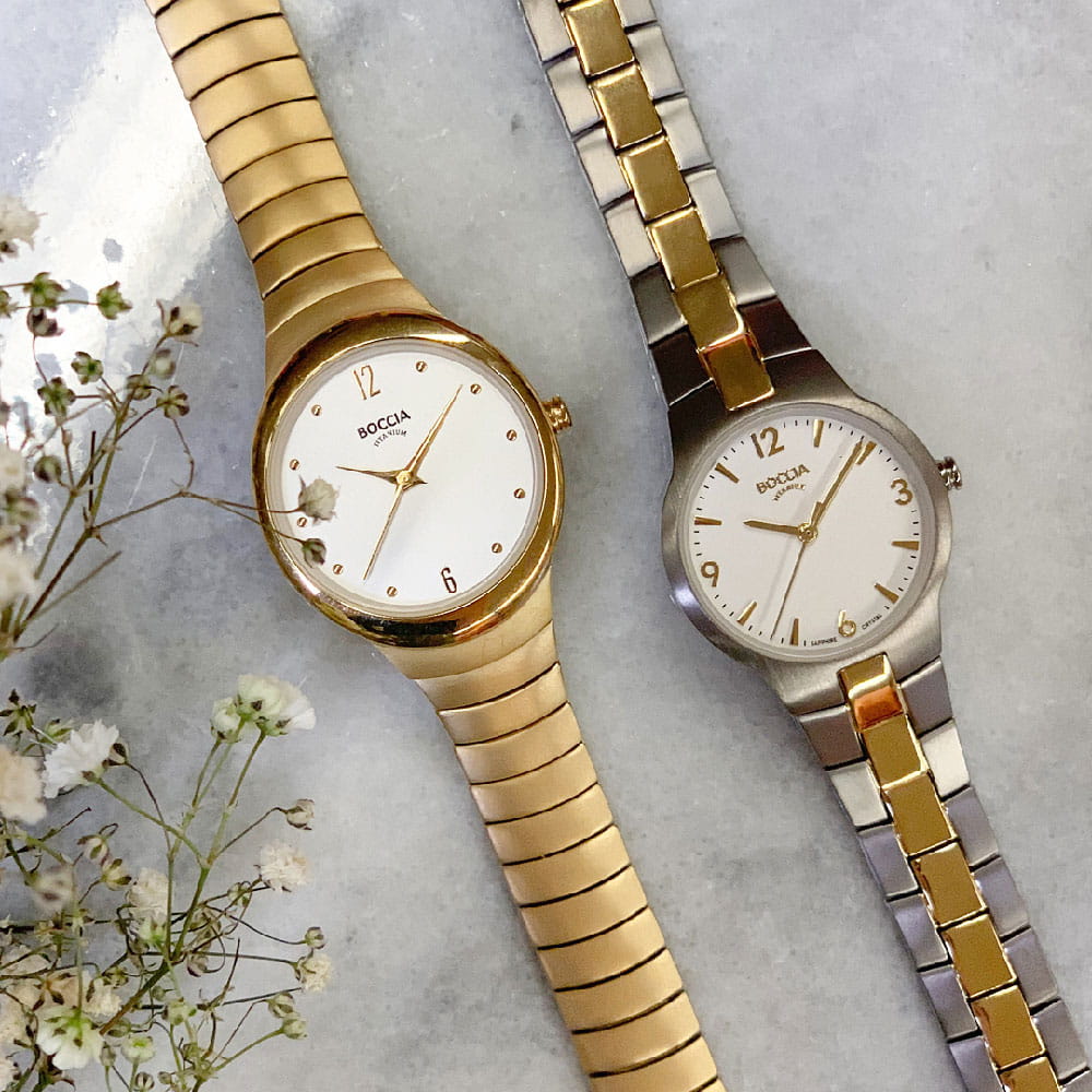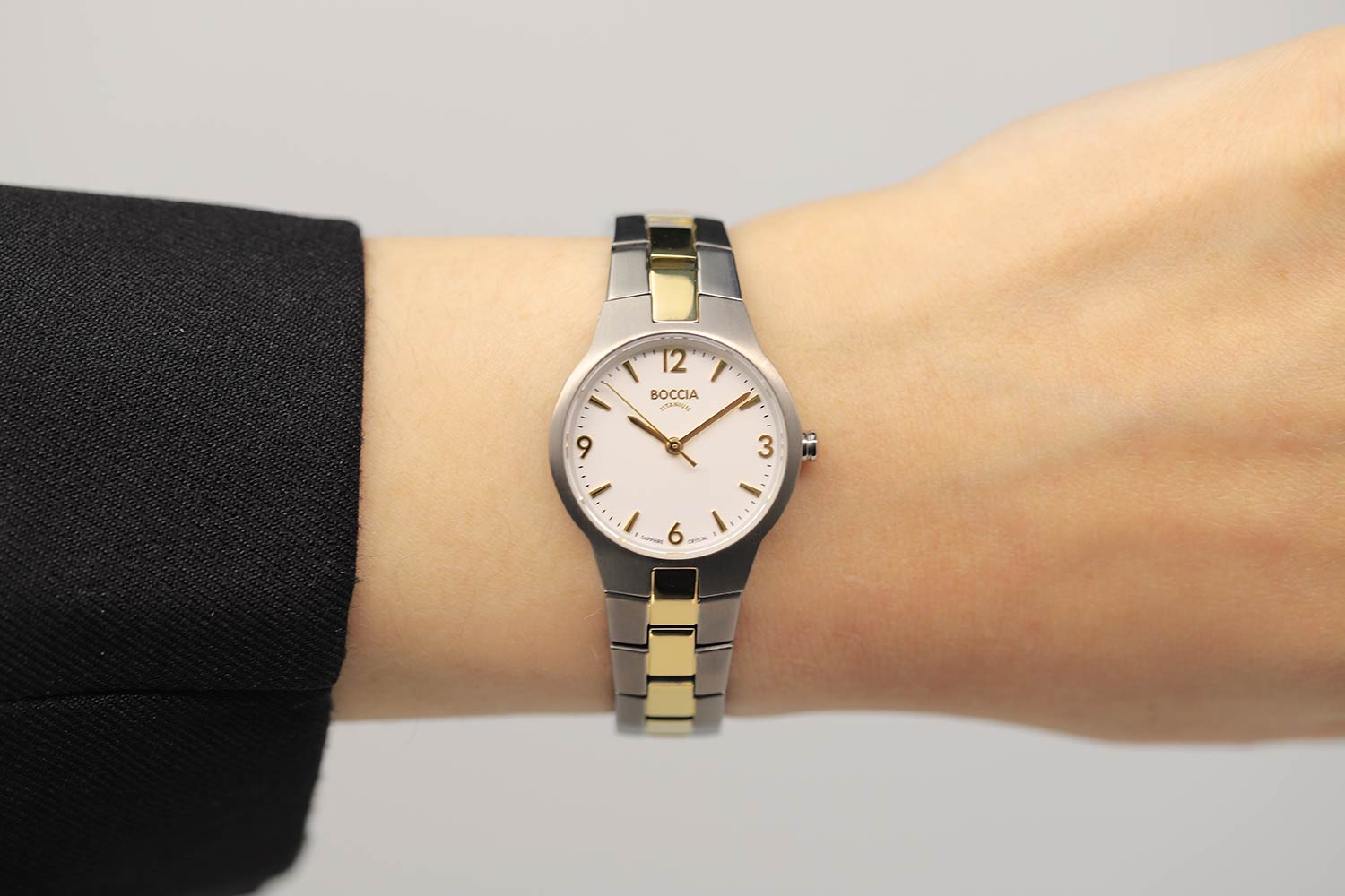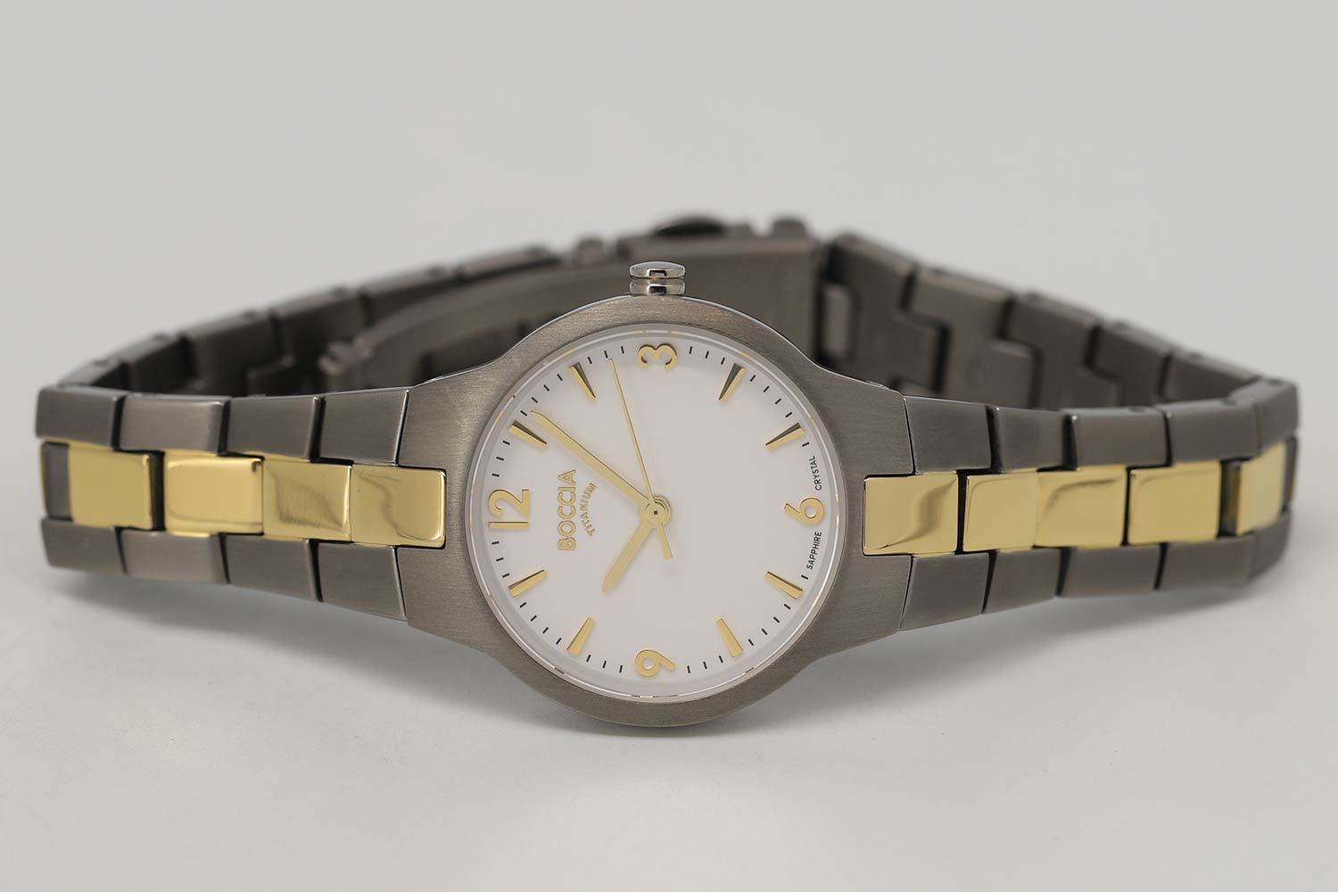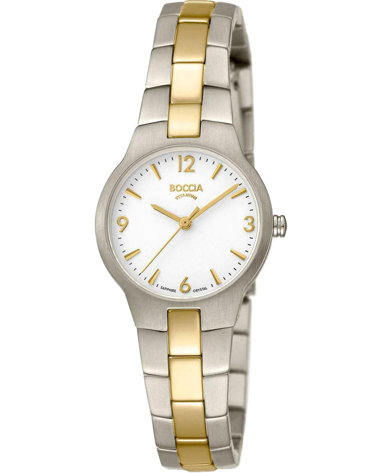 Женские наручные часы Boccia Titanium 3312-02 с надёжным кварцевым механизмом. Корпус и браслет часов изготовлены из титана. Сапфировое стеклоСапфировое стеклоПрочный и надёжный материал из кристалла сапфира синтетического происхождения, характеризующийся особой твёрдостью и устойчивостью к царапинам и повреждениям. устойчивое к мелким механическим повреждениям. Класс водозащиты: 50 метров, позволит защитить корпус от случайных брызг или капель дождя. Титановый браслет с частичным PVD-покрытиемPVDУльтратонкое покрытие наносится в технике вакуумного напыления, сочетает в себе нитрид титана особой прочности со слоем золота или оксида хрома. Несёт в себе декоративную или защитную функцию. на раскладной застёжкеРаскладная застёжкаТакой тип застёжки используется только на браслетах из металла. Она никогда не раскрывается полностью, происходит разделение на 2 и более частей. Раскладывающая застёжка снизит вероятность потери часов к минимуму..