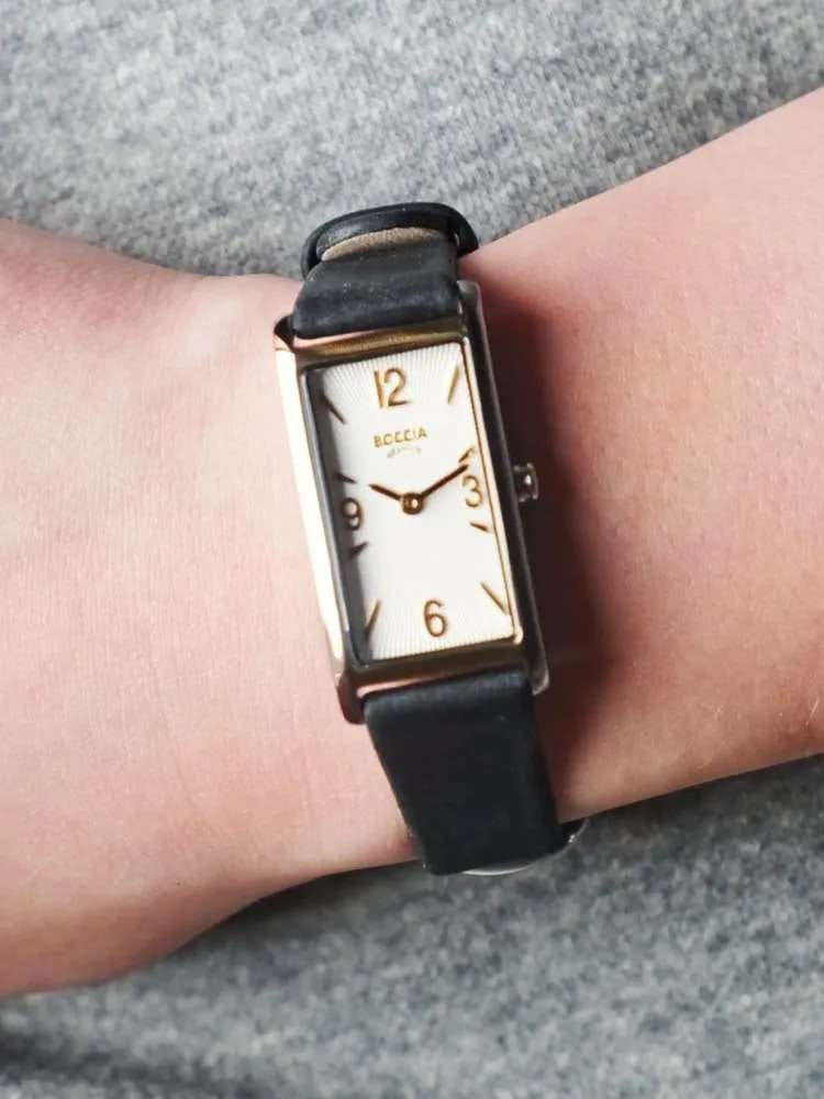 Женские часы Boccia 3366-02, которые станут стильным и функциональным аксессуаром для современной женщины. Эти часы оснащены кварцевым механизмом Miyota 5Y20, обеспечивающим точное и надежное отсчитывание времени. Центральные часовая и минутная стрелки выделяются на элегантном серебристом циферблате, создавая контрастный и выразительный образ. Прямоугольный корпус часов выполнен из суперлегкого титана с частичным PVDPVDУльтратонкое покрытие наносится в технике вакуумного напыления, сочетает в себе нитрид титана особой прочности со слоем золота или оксида хрома. Несёт в себе декоративную или защитную функцию.-покрытием цвета желтого золота, что делает их невероятно комфортными для ежедневного ношения. Размер корпуса 35х18 мм добавляет изысканности и утонченности внешнему виду. Особое внимание привлекает черный кожаный ремешок, который придаёт часам современный и элегантный вид. А Классическая застежка обеспечивает удобство и надежность фиксации. Прочное выпуклое минеральное стеклоМинеральное стеклоМинеральное стекло представляет собой искусственно выращенный минерал кварца. Такое стекло отличается особой устойчивостью к повреждениям и царапинам. Уступает по некоторым качествам сапфировому стеклу. защищает циферблат от мелких механических повреждений, гарантируя долговечность и сохранение первоначального внешнего вида. Водостойкость уровня WR 30 обеспечивает защиту от брызг, делая их подходящими для повседневного использования.