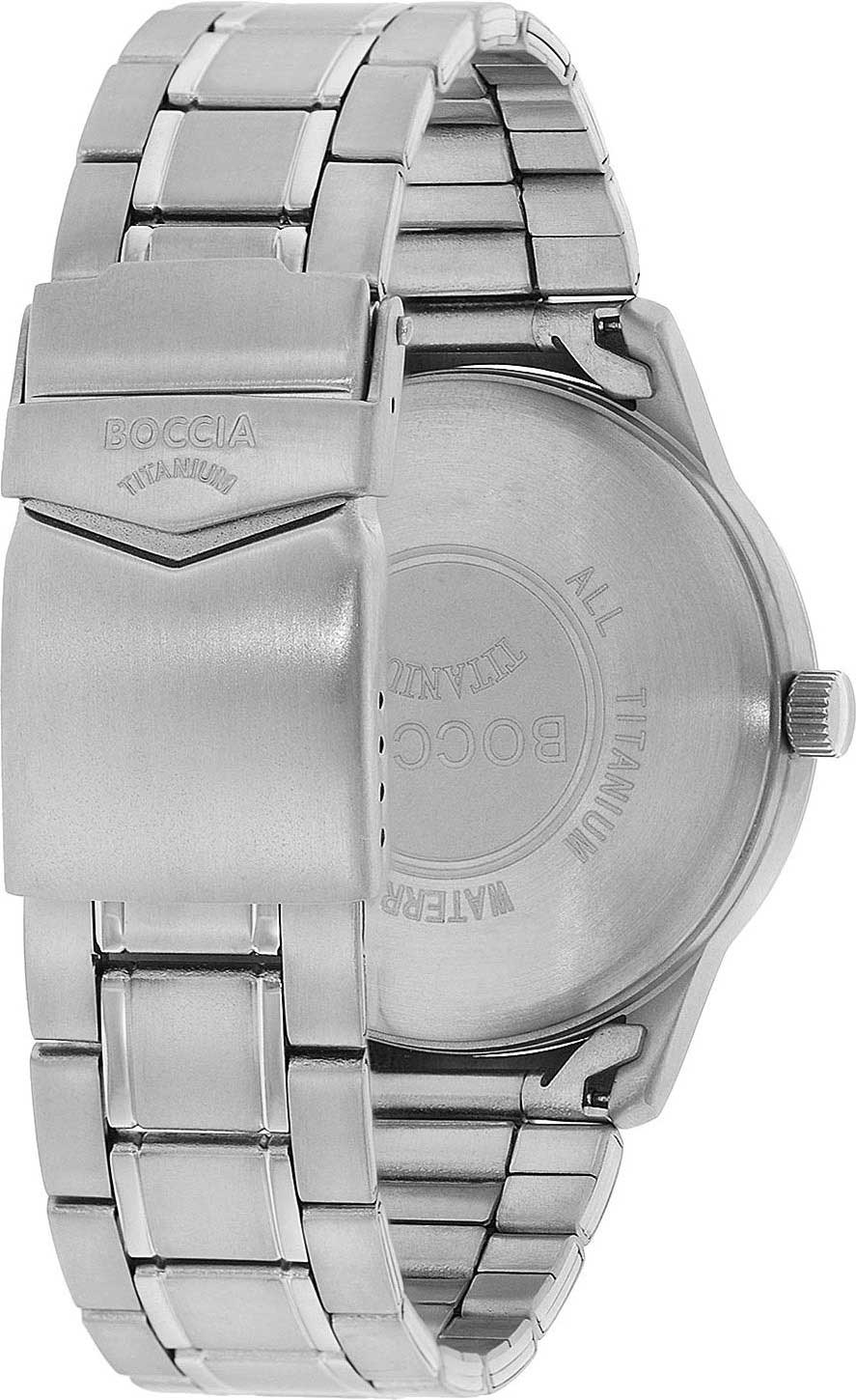 Мужские немецкие титановые часы Boccia Titanium 3621-03, кварцевый механизм с высокой точностью. Минеральное стеклоМинеральное стеклоМинеральное стекло представляет собой искусственно выращенный минерал кварца. Такое стекло отличается особой устойчивостью к повреждениям и царапинам. Уступает по некоторым качествам сапфировому стеклу. устойчивое к появлению царапин, обладающее высокой прозрачностью. Корпус изготовлен из титана. Стрелки и метки с люминесцентным покрытиемЛюминесцентное покрытиеПозволяет считывать показания времени в темноте. Производители наносят на стрелки, часовые индексы, безель или поверхность циферблата светонакопительный состав, дающий холодное свечение.. Окошко даты в положении 3 часов. Класс водозащиты: 100 метров, позволит плавать, нырять и заниматься другими водными видами спорта. Браслет из титана на раскладной застёжкеРаскладная застёжкаТакой тип застёжки используется только на браслетах из металла. Она никогда не раскрывается полностью, происходит разделение на 2 и более частей. Раскладывающая застёжка снизит вероятность потери часов к минимуму..