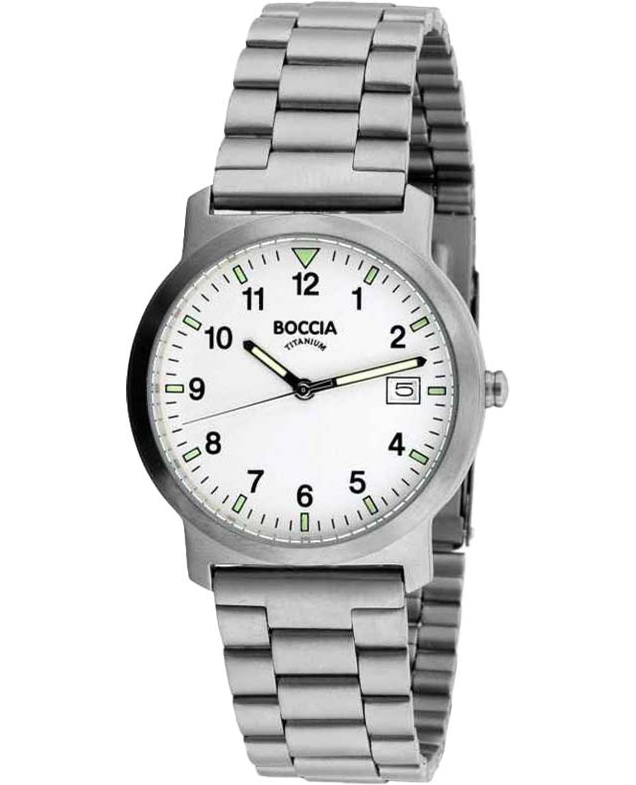 Мужские наручные часы Boccia Titanium 3630-01 с надёжным кварцевым механизмом. Корпус и браслет часов изготовлены из титана. Минеральное стеклоМинеральное стеклоМинеральное стекло представляет собой искусственно выращенный минерал кварца. Такое стекло отличается особой устойчивостью к повреждениям и царапинам. Уступает по некоторым качествам сапфировому стеклу. устойчивое к мелким механическим повреждениям. Класс водозащиты: 50 метров, позволит защитить корпус от случайных брызг или капель дождя. Окошко даты в положении 3 часа. Титановый браслет на раскладной застёжкеРаскладная застёжкаТакой тип застёжки используется только на браслетах из металла. Она никогда не раскрывается полностью, происходит разделение на 2 и более частей. Раскладывающая застёжка снизит вероятность потери часов к минимуму.. Стрелки и метки с люминесцентным покрытиемЛюминесцентное покрытиеПозволяет считывать показания времени в темноте. Производители наносят на стрелки, часовые индексы, безель или поверхность циферблата светонакопительный состав, дающий холодное свечение..