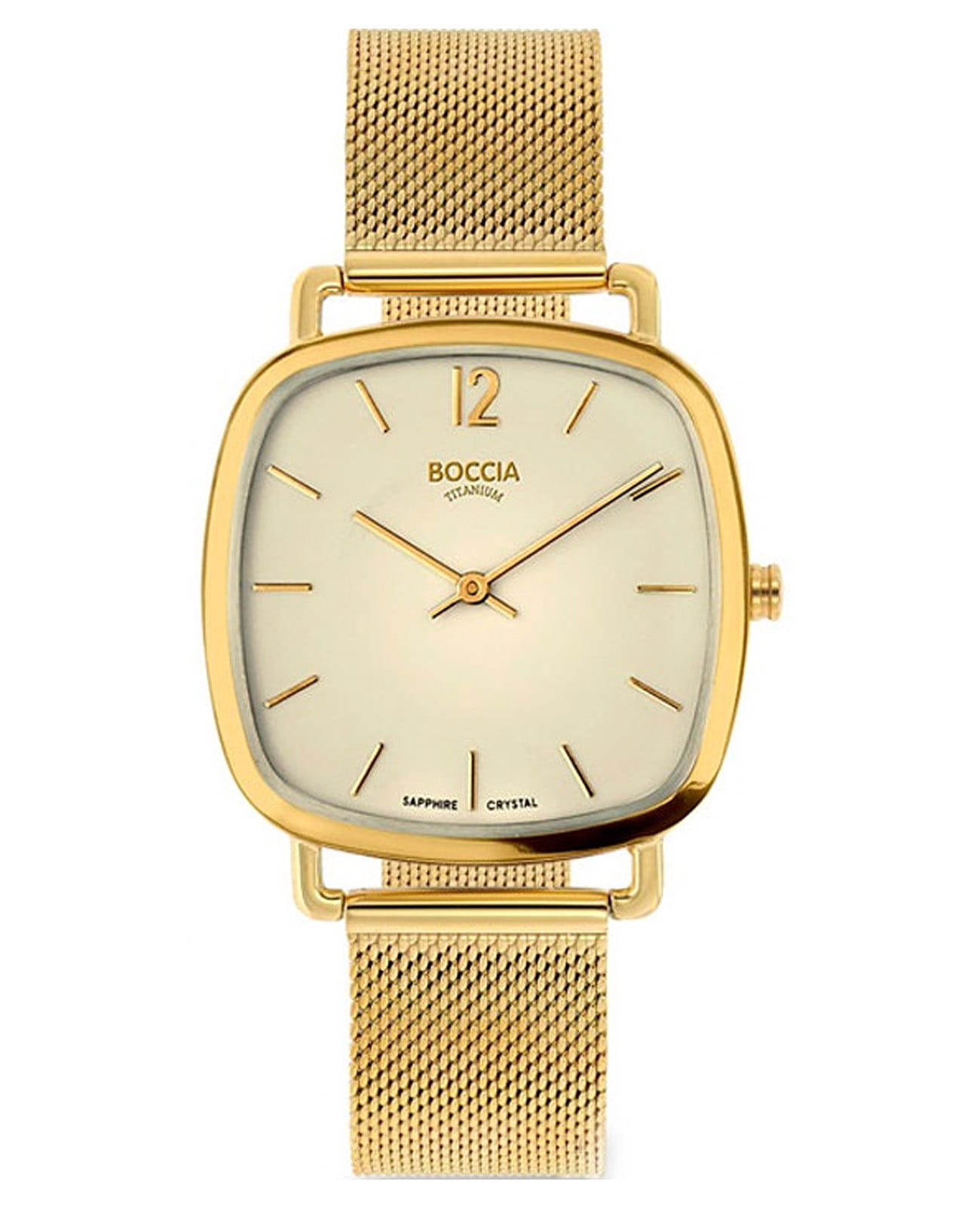 Женские немецкие титановые часы Boccia Titanium Square 3334-07, кварцевый механизм с высокой точностью. Минеральное стеклоМинеральное стеклоМинеральное стекло представляет собой искусственно выращенный минерал кварца. Такое стекло отличается особой устойчивостью к повреждениям и царапинам. Уступает по некоторым качествам сапфировому стеклу. устойчивое к появлению царапин, обладающее высокой прозрачностью. Квадратный корпус изготовлен из титана c PVDPVDУльтратонкое покрытие наносится в технике вакуумного напыления, сочетает в себе нитрид титана особой прочности со слоем золота или оксида хрома. Несёт в себе декоративную или защитную функцию. покрытием. Метки в виде штрихов. Класс водозащиты: 30 метров, позволит защитить корпус от случайных брызг или капель дождя. Стальной браслет миланского плетения c PVDPVDУльтратонкое покрытие наносится в технике вакуумного напыления, сочетает в себе нитрид титана особой прочности со слоем золота или оксида хрома. Несёт в себе декоративную или защитную функцию. покрытием на раскладной застёжкеРаскладная застёжкаТакой тип застёжки используется только на браслетах из металла. Она никогда не раскрывается полностью, происходит разделение на 2 и более частей. Раскладывающая застёжка снизит вероятность потери часов к минимуму..