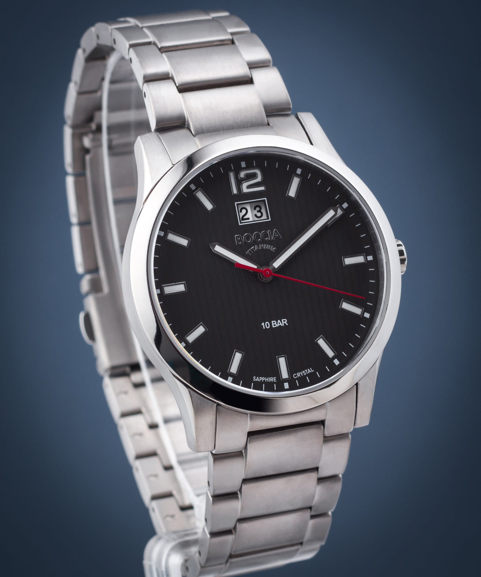 Мужские наручные часы Boccia Titanium 3580-02 с надёжным кварцевым механизмом. Корпус и браслет часов изготовлены из титана. Сапфировое стеклоСапфировое стеклоПрочный и надёжный материал из кристалла сапфира синтетического происхождения, характеризующийся особой твёрдостью и устойчивостью к царапинам и повреждениям. устойчивое к мелким механическим повреждениям. Класс водозащиты: 50 метров, позволит защитить корпус от случайных брызг или капель дождя. Титановый браслет на раскладной застёжкеРаскладная застёжкаТакой тип застёжки используется только на браслетах из металла. Она никогда не раскрывается полностью, происходит разделение на 2 и более частей. Раскладывающая застёжка снизит вероятность потери часов к минимуму.. Окошко даты находится в положении 12 часов. Стрелки и метки с люминесцентным покрытиемЛюминесцентное покрытиеПозволяет считывать показания времени в темноте. Производители наносят на стрелки, часовые индексы, безель или поверхность циферблата светонакопительный состав, дающий холодное свечение..