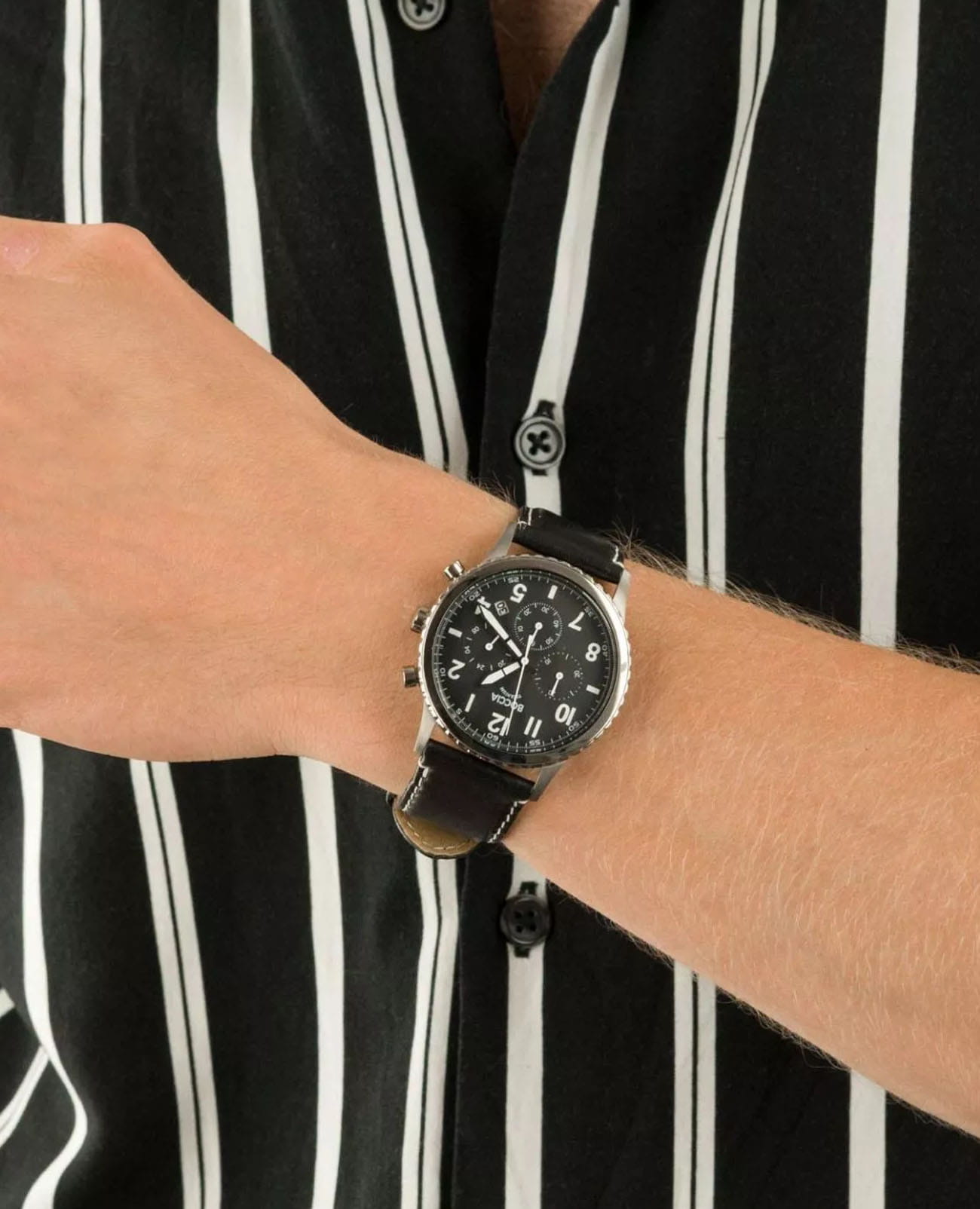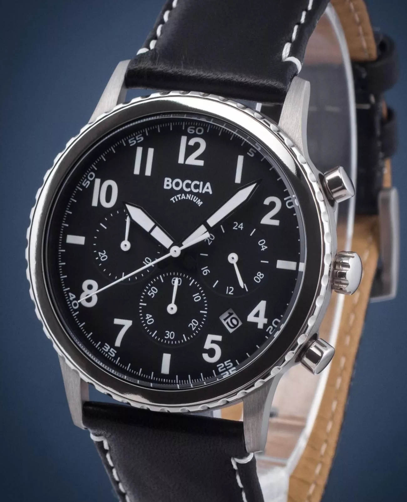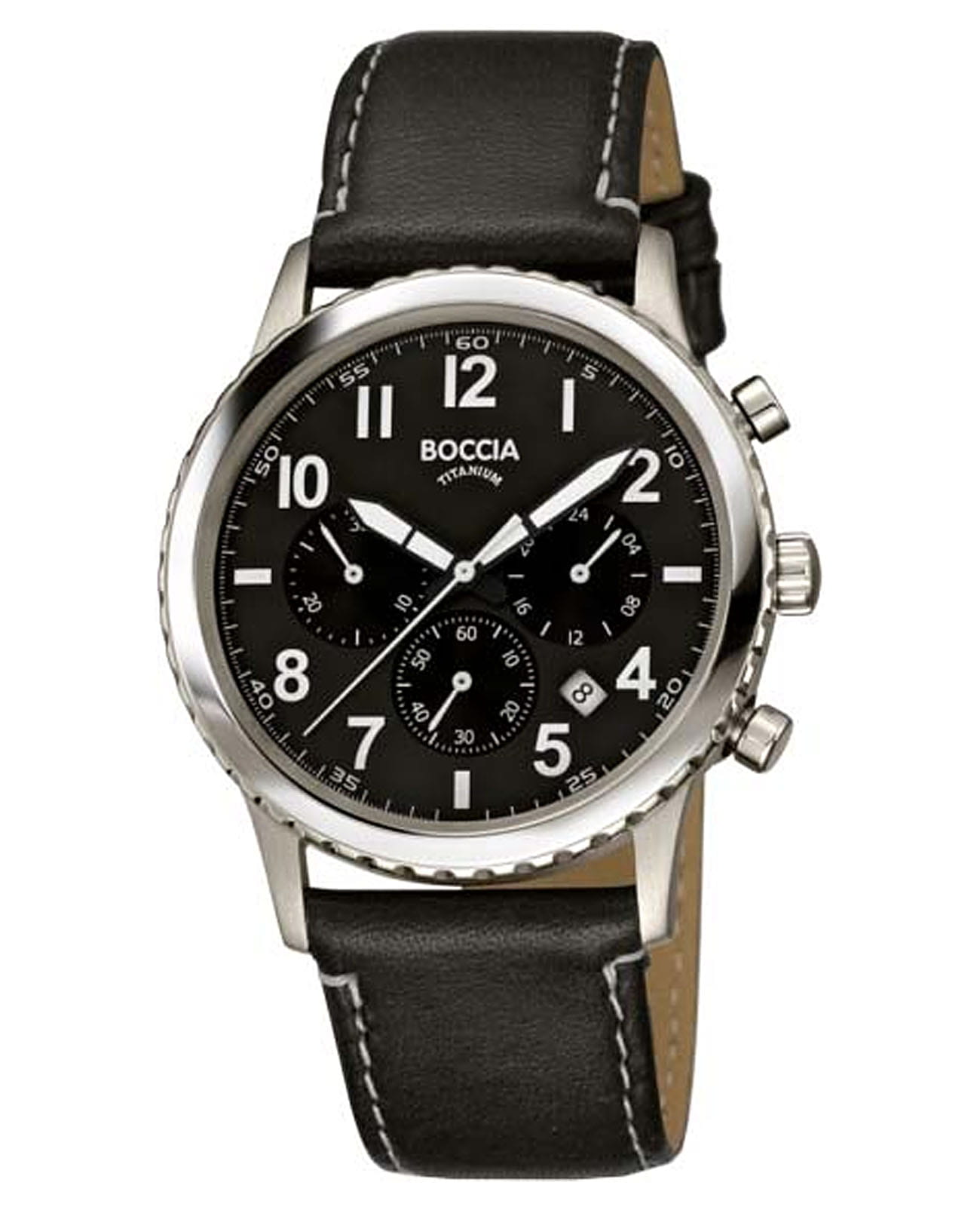 Мужские немецкие титановые часы-хронографХронографФункция позволяет измерять отрезки времени с особой точностью: часы, минуты, секунды. Верным признаком хронографа является наличие на циферблате 3 дополнительных окошек-счётчиков. с секундомеромСекундомерСекундоме́р — прибор, способный измерять интервалы времени с точностью до долей секунды. Boccia Titanium Circle-Oval 3745-01, кварцевый механизм с высокой точностью. Сапфировое стеклоСапфировое стеклоПрочный и надёжный материал из кристалла сапфира синтетического происхождения, характеризующийся особой твёрдостью и устойчивостью к царапинам и повреждениям. устойчивое к появлению царапин, обладающее высокой прозрачностью. Корпус изготовлен из титана. На цифрблате расположены три дополнительных индикатора и окошко даты. Стрелки с люминесцентным покрытиемЛюминесцентное покрытиеПозволяет считывать показания времени в темноте. Производители наносят на стрелки, часовые индексы, безель или поверхность циферблата светонакопительный состав, дающий холодное свечение.. Класс водозащиты: 50 метров, позволит защитить корпус от случайных брызг или капель дождя. Кожаный браслет на стандартной застежке.