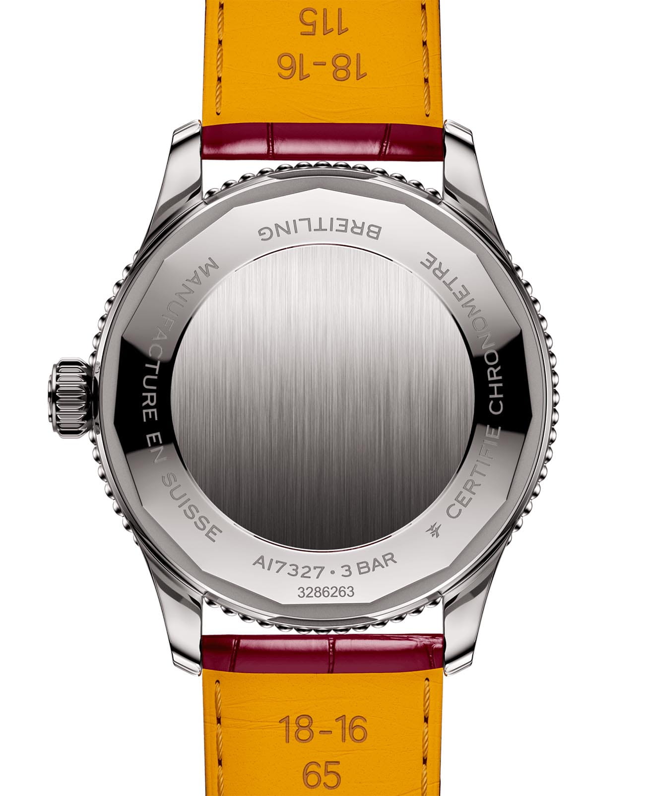 Швейцарские унисекс часы-хронометр Breitling Navitimer Automatic 36 A17327211G1P1, механический механизм (автоматический калибр) с высокой точностью. Сапфировое стеклоСапфировое стеклоПрочный и надёжный материал из кристалла сапфира синтетического происхождения, характеризующийся особой твёрдостью и устойчивостью к царапинам и повреждениям. устойчивое к появлению царапин, обладающее высокой прозрачностью. Класс водозащиты: 30 метров, позволит защитить корпус от случайных брызг или капель дождя. Корпус часов изготовлен из нержавеющей стали. Ремешок из кожи аллигатора с раскладной застёжкойРаскладная застёжкаТакой тип застёжки используется только на браслетах из металла. Она никогда не раскрывается полностью, происходит разделение на 2 и более частей. Раскладывающая застёжка снизит вероятность потери часов к минимуму.. Часы оснащены логарифмической линейкой. Стрелки с люминесцентным покрытиемЛюминесцентное покрытиеПозволяет считывать показания времени в темноте. Производители наносят на стрелки, часовые индексы, безель или поверхность циферблата светонакопительный состав, дающий холодное свечение..