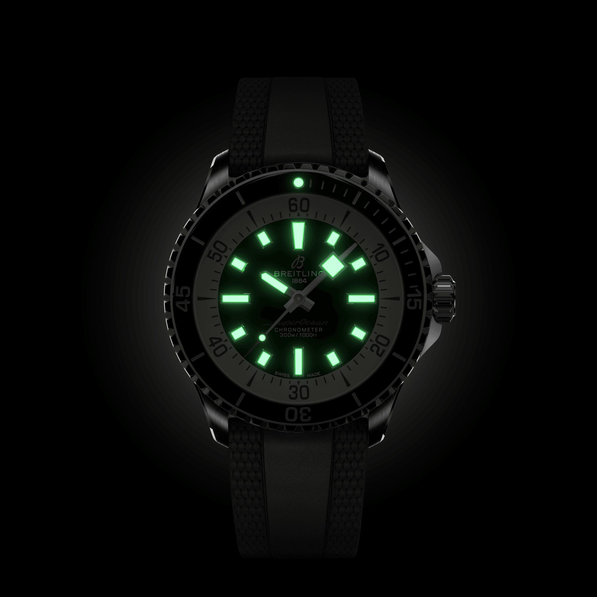 Мужские водонепроницаемые швейцарские часы Breitling Superocean Automatic 42 A17375211B1S1, механический механизм (автоматический калибр) с высокой точностью. Сапфировое стеклоСапфировое стеклоПрочный и надёжный материал из кристалла сапфира синтетического происхождения, характеризующийся особой твёрдостью и устойчивостью к царапинам и повреждениям. устойчивое к появлению царапин, обладающее высокой прозрачностью. Класс водозащиты: 300 метров, позволит плавать, нырять и заниматься другими водными видами спорта. Корпус часов изготовлен из стали. Силиконовый ремешок с раскладной застёжкойРаскладная застёжкаТакой тип застёжки используется только на браслетах из металла. Она никогда не раскрывается полностью, происходит разделение на 2 и более частей. Раскладывающая застёжка снизит вероятность потери часов к минимуму.. Стрелки и метки с люминесцентным покрытиемЛюминесцентное покрытиеПозволяет считывать показания времени в темноте. Производители наносят на стрелки, часовые индексы, безель или поверхность циферблата светонакопительный состав, дающий холодное свечение.. Широкие стрелки и индексы с люминесцентным покрытиемЛюминесцентное покрытиеПозволяет считывать показания времени в темноте. Производители наносят на стрелки, часовые индексы, безель или поверхность циферблата светонакопительный состав, дающий холодное свечение. обеспечивают легкую читаемость под водой. Вращающийся стальной безельБезельВнешний ободок, закрепляющий стекло. В спортивных часах так называется поворотное кольцо с делениями на циферблате, выполняет роль таймера – замеряет отрезки времени на шкале. Неподвижный безель – элемент декора. Однонаправленно вращающийся безель на дайверских часах позволяет фиксировать моменты погружения и выныривания на поверхность. с люминесцентным покрытиемЛюминесцентное покрытиеПозволяет считывать показания времени в темноте. Производители наносят на стрелки, часовые индексы, безель или поверхность циферблата светонакопительный состав, дающий холодное свечение. Superluminova из нержавеющей стали и керамики, защищенный от царапин, никогда не изнашивается и не выцветает.