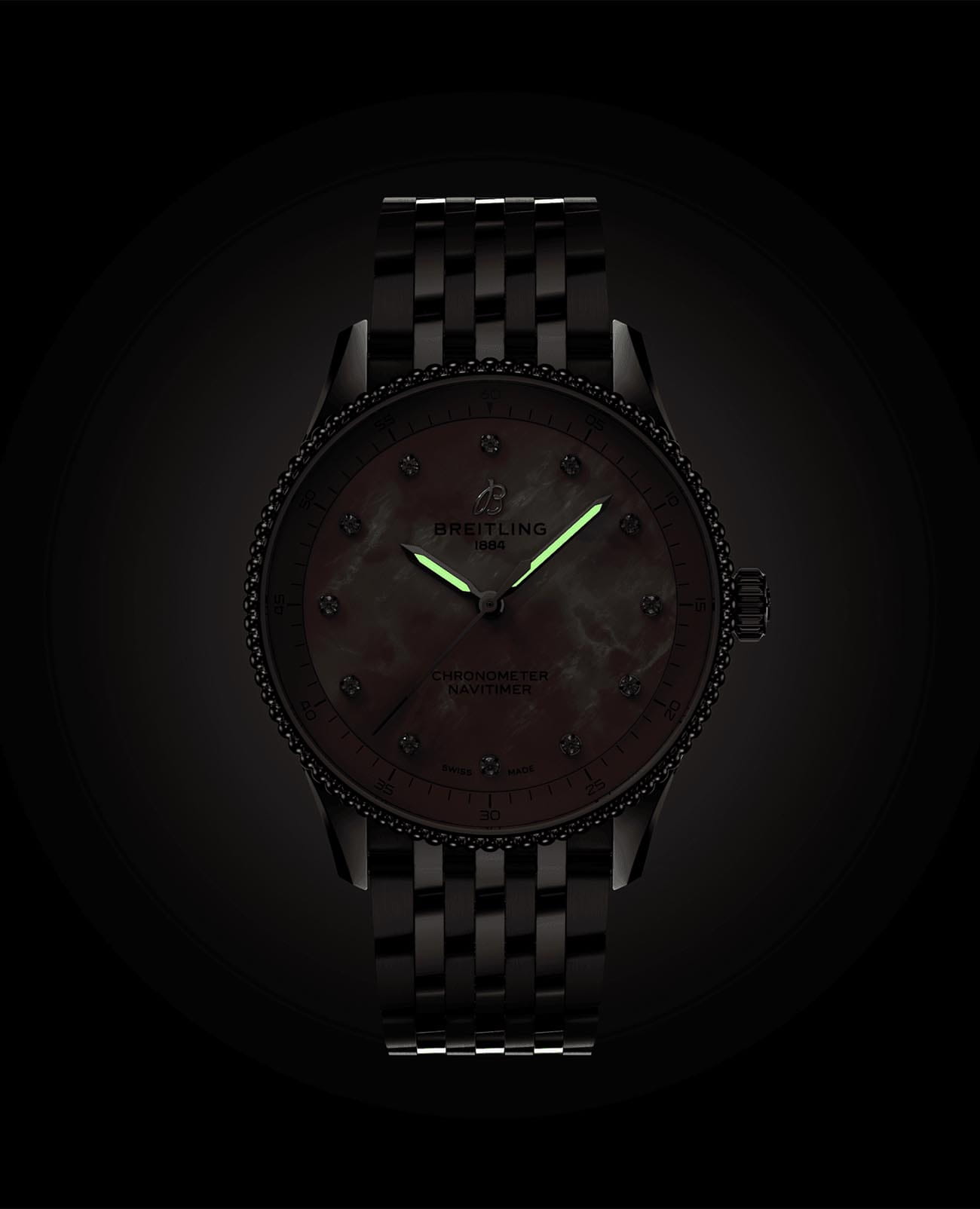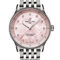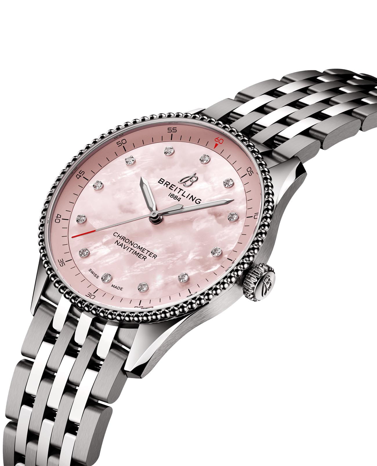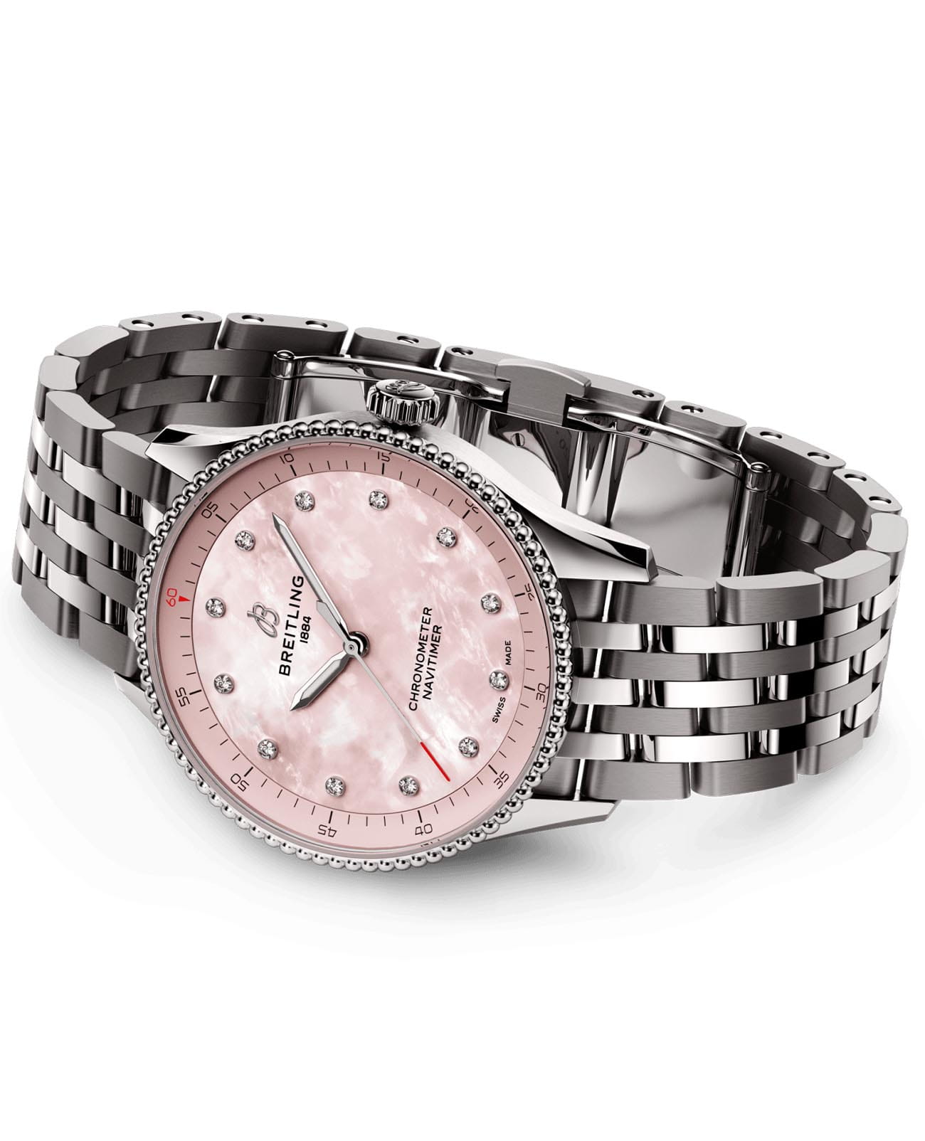 Швейцарские унисекс часы-хронометр Breitling Navitimer Automatic 32 A77320D91K1A1, механический механизм (автоматический калибр) с высокой точностью. Сапфировое стеклоСапфировое стеклоПрочный и надёжный материал из кристалла сапфира синтетического происхождения, характеризующийся особой твёрдостью и устойчивостью к царапинам и повреждениям. устойчивое к появлению царапин, обладающее высокой прозрачностью. Класс водозащиты: 50 метров, позволит защитить корпус от случайных брызг или капель дождя. Корпус и браслет часов изготовлены из нержавеющей стали. Стальной браслет на застёжке-бабочке с кнопкамиЗастёжка "бабочка"Такой вид застёжки дополняется предохранителями, помогающими избежать случайного раскрытия браслета. Обладают изящным исполнением. . Стрелки с люминесцентным покрытиемЛюминесцентное покрытиеПозволяет считывать показания времени в темноте. Производители наносят на стрелки, часовые индексы, безель или поверхность циферблата светонакопительный состав, дающий холодное свечение.. Циферблат инкрустирован бриллантами.
