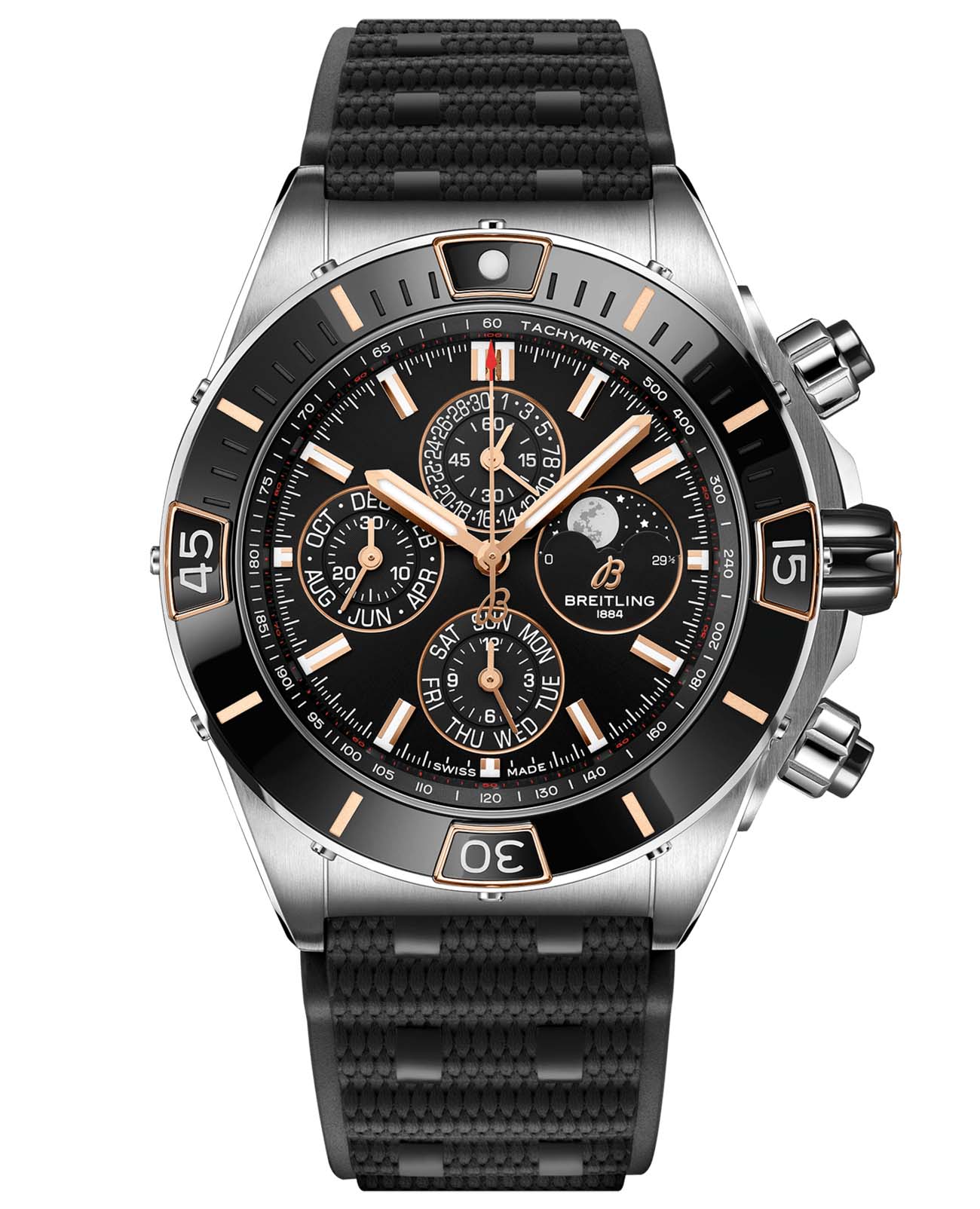 «Реактивные» часы Breitling с четырехлетним календарем на все случаи жизни. Часы Super Chronomat созданы по мотивам оригинальной модели Chronomat 80-х годов, которая была разработана компанией Breitling для асов пилотажной эскадрильи. Обладающие наиболее смелым дизайном из всех моделей коллекции Chronomat, часы Super Chronomat отличаются кармической инкрустацией на безеле, кнопках хронографа и заводной головке.