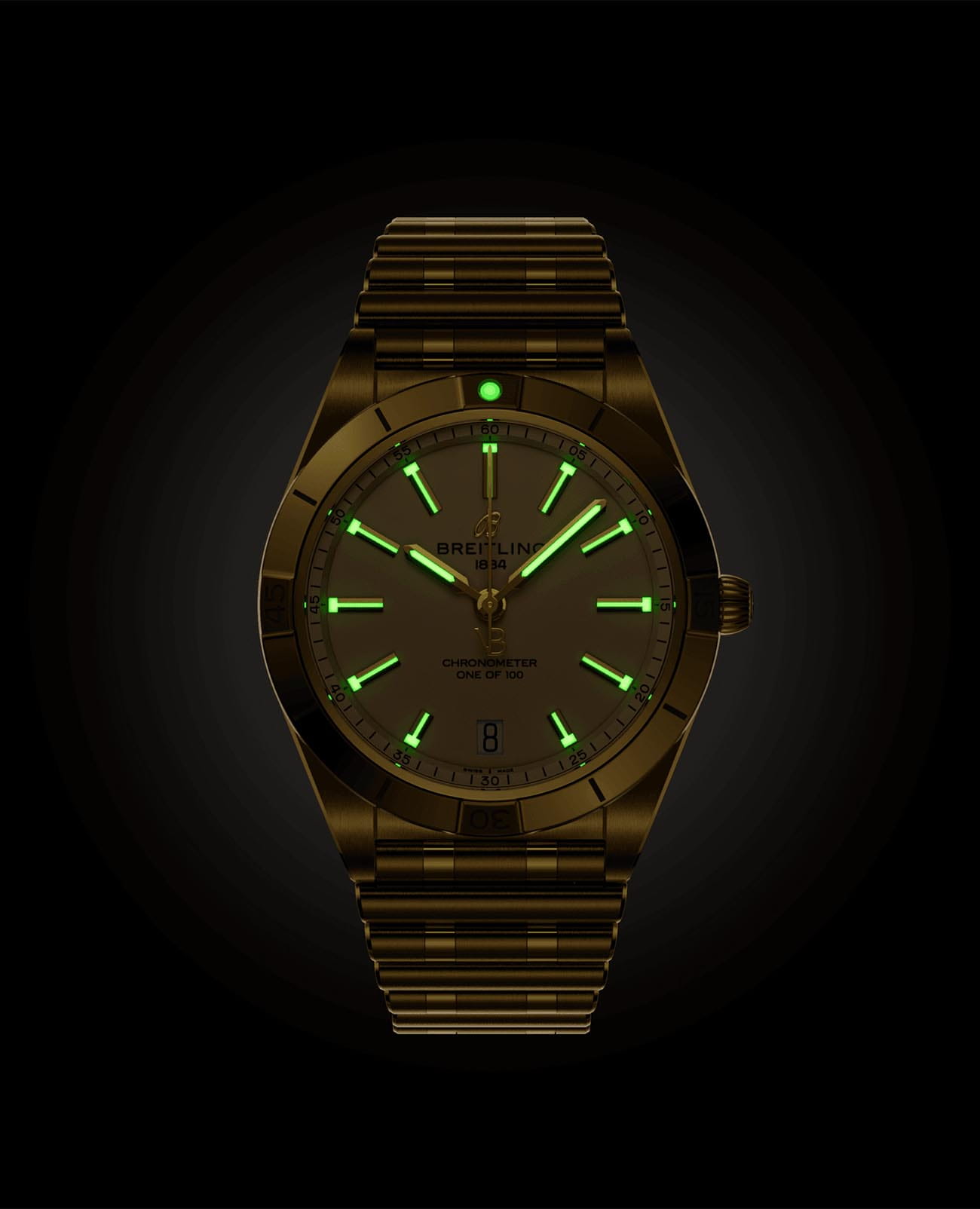 . Браслет на застёжке-бабочке с кнопкамиЗастёжка "бабочка"Такой вид застёжки дополняется предохранителями, помогающими избежать случайного раскрытия браслета. Обладают изящным исполнением. . Стрелки и метки с люминесцентным покрытиемЛюминесцентное покрытиеПозволяет считывать показания времени в темноте. Производители наносят на стрелки, часовые индексы, безель или поверхность циферблата светонакопительный состав, дающий холодное свечение.. Класс водозащиты: 100 метров, позволит плавать, нырять и заниматься другими водными видами спорта. Окошко даты находится в положении 6 часов.