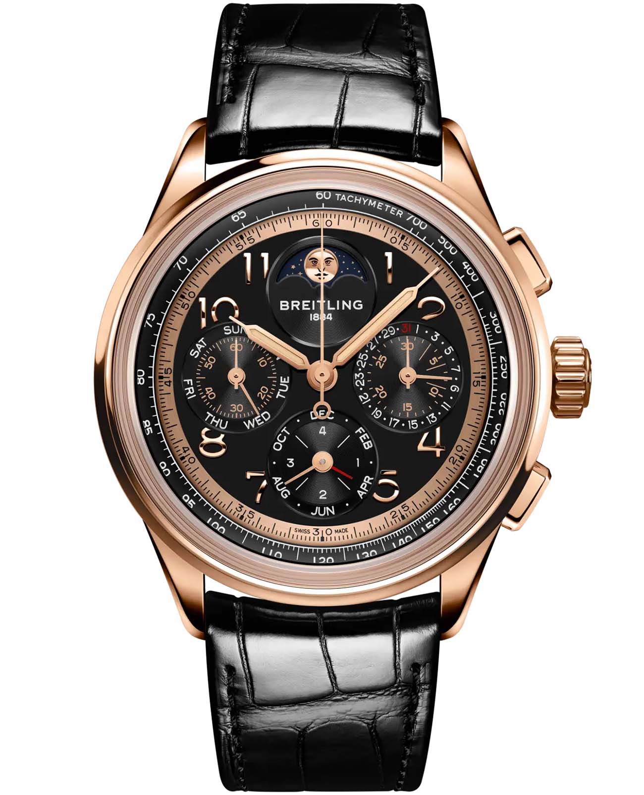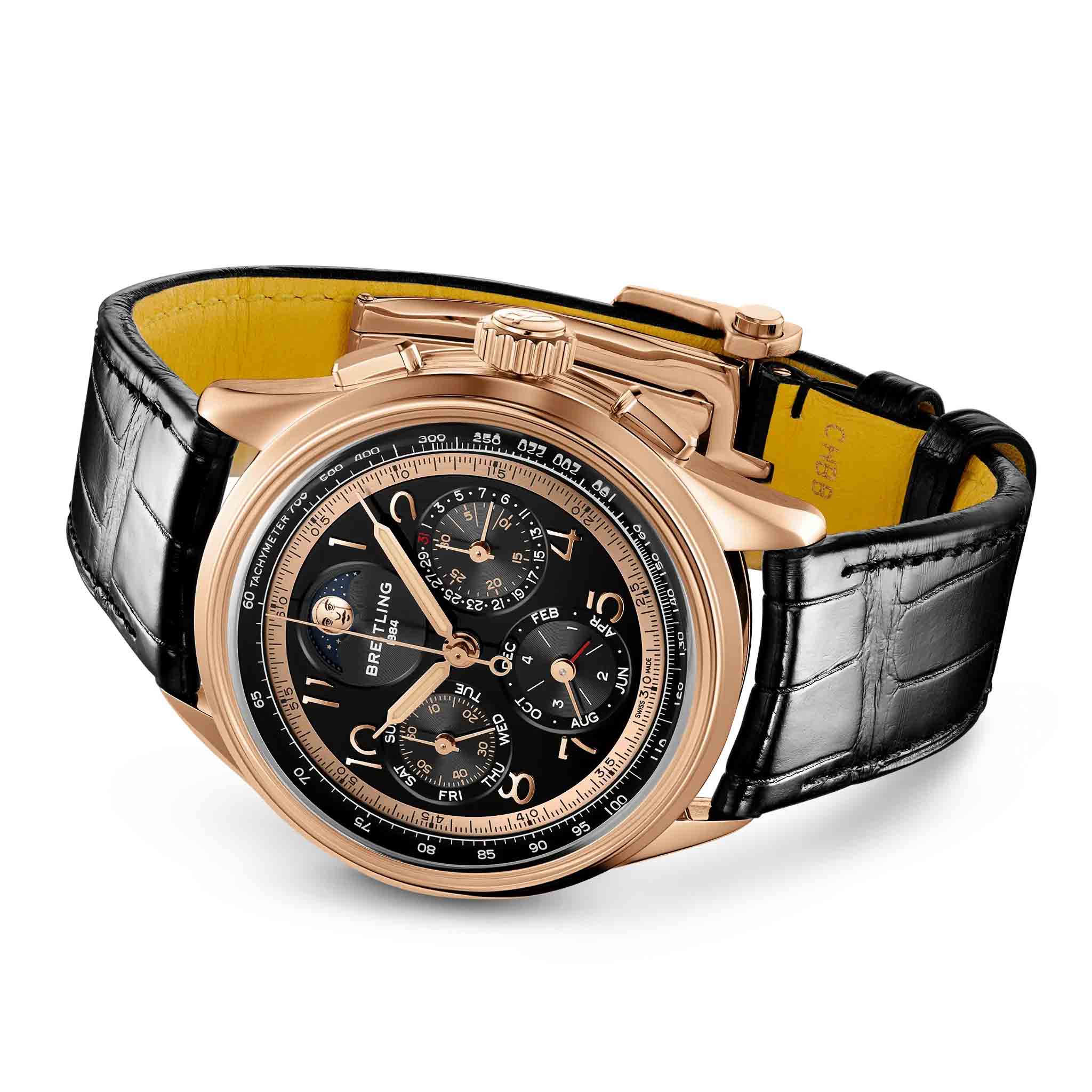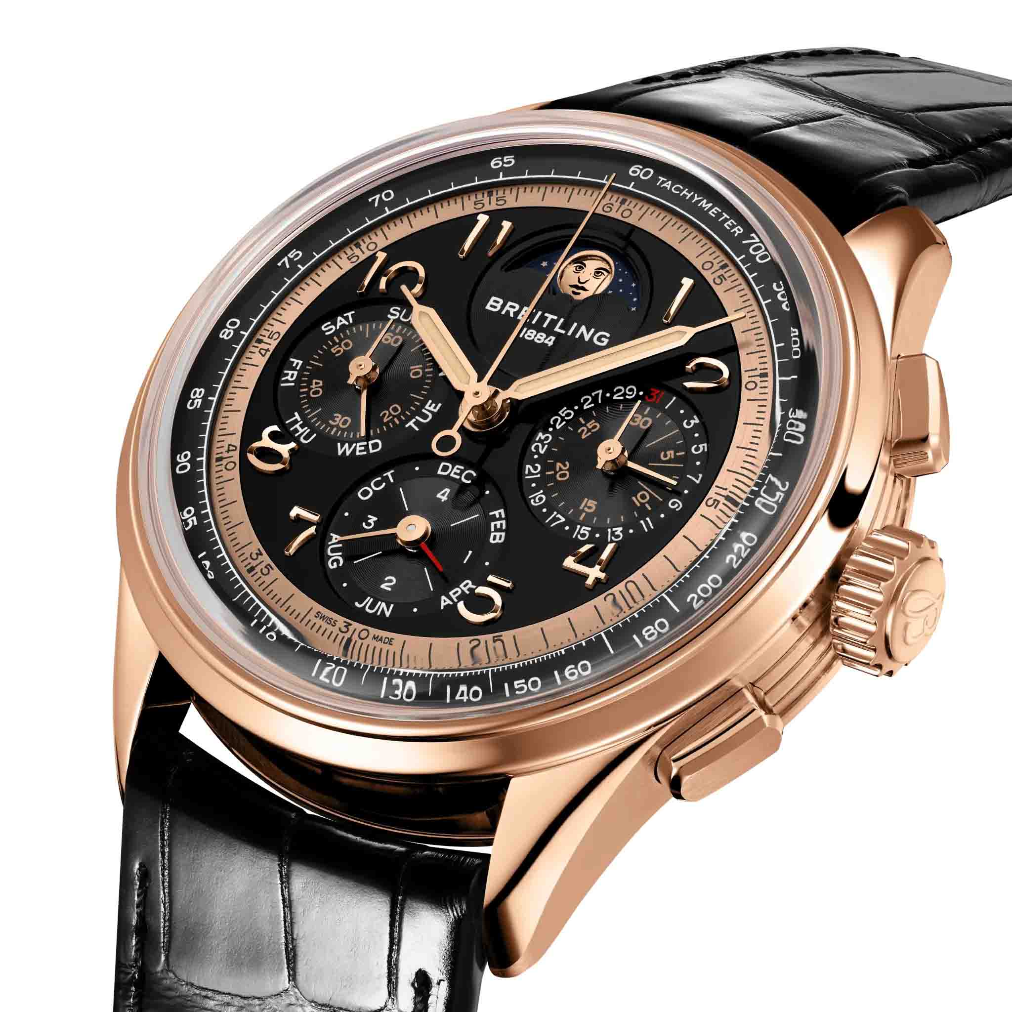 Мужские механические часы Breitling Premier RB19401A1B1P1 — это роскошный аксессуар, сочетающий в себе классический стиль и передовые технологии. Модель выполнена из 18-каратного красного золота с диаметром корпуса 42 мм и толщиной 15,6 мм, что делает её прочной и устойчивой к царапинам. Циферблат черного цвета дополнен индикатором фаз Луны, а его поверхность защищена выпуклым сапфировым стекломСапфировое стеклоПрочный и надёжный материал из кристалла сапфира синтетического происхождения, характеризующийся особой твёрдостью и устойчивостью к царапинам и повреждениям. с двусторонним антибликовым покрытиемАнтибликовое покрытиеСлой оксида металла в 0,13-0,3 микрон, благодаря которому стекло часов не бликует и не отражает свет. Антибликовое покрытие уменьшает отражение света в 10 раз, обеспечивая отличную читаемость показателей циферблата., устойчивым к повреждениям. Стрелки оснащены Люминесцентным покрытиемЛюминесцентное покрытиеПозволяет считывать показания времени в темноте. Производители наносят на стрелки, часовые индексы, безель или поверхность циферблата светонакопительный состав, дающий холодное свечение.Часы оснащены мануфактурным автоматическим механизмом Breitling Caliber 19, обеспечивающим запас хода до 96 часов и частоту колебаний 28 800 полуколебаний в час. Функции включают отображение времени, хронографХронографФункция позволяет измерять отрезки времени с особой точностью: часы, минуты, секунды. Верным признаком хронографа является наличие на циферблате 3 дополнительных окошек-счётчиков. с точностью 1/4 секунды и временем измерения до 30 минут, а также вечный календарь с указанием фаз Луны. Водонепроницаемость позволяет плавать без, глубокого погружения Ремешок из черной кожи аллигатора шириной 22 мм оснащён раскладной застёжкойРаскладная застёжкаТакой тип застёжки используется только на браслетах из металла. Она никогда не раскрывается полностью, происходит разделение на 2 и более частей. Раскладывающая застёжка снизит вероятность потери часов к минимуму. с фиксатором, обеспечивающей комфорт и надёжную фиксацию на запястье. На задней крышке выгравирован логотип, подтверждающий уникальность изделия. Это лимитированная серия, выпущенная всего 140 экземпляров, что подчёркивает её уникальность. Гарантия 2 года подтверждает качество и долговечность изделия. Эти часы станут универсальным аксессуаром для тех, кто ценит сочетание стиля, функциональности и швейцарского мастерства — идеальный выбор для повседневной носки и торжественных случаев.