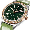 и циферблат инкрустированы бриллиантами. Ремешок из кожи аллигатора с раскладной застёжкойРаскладная застёжкаТакой тип застёжки используется только на браслетах из металла. Она никогда не раскрывается полностью, происходит разделение на 2 и более частей. Раскладывающая застёжка снизит вероятность потери часов к минимуму.. Стрелки и метки с люминесцентным покрытиемЛюминесцентное покрытиеПозволяет считывать показания времени в темноте. Производители наносят на стрелки, часовые индексы, безель или поверхность циферблата светонакопительный состав, дающий холодное свечение.. Класс водозащиты: 100 метров, позволит плавать, нырять и заниматься другими водными видами спорта.
