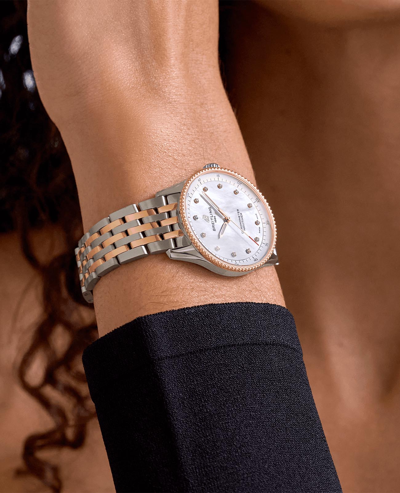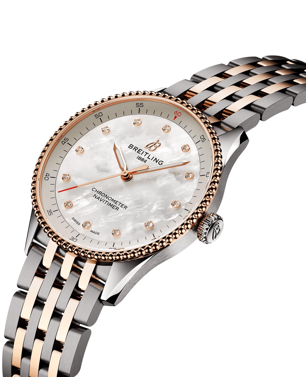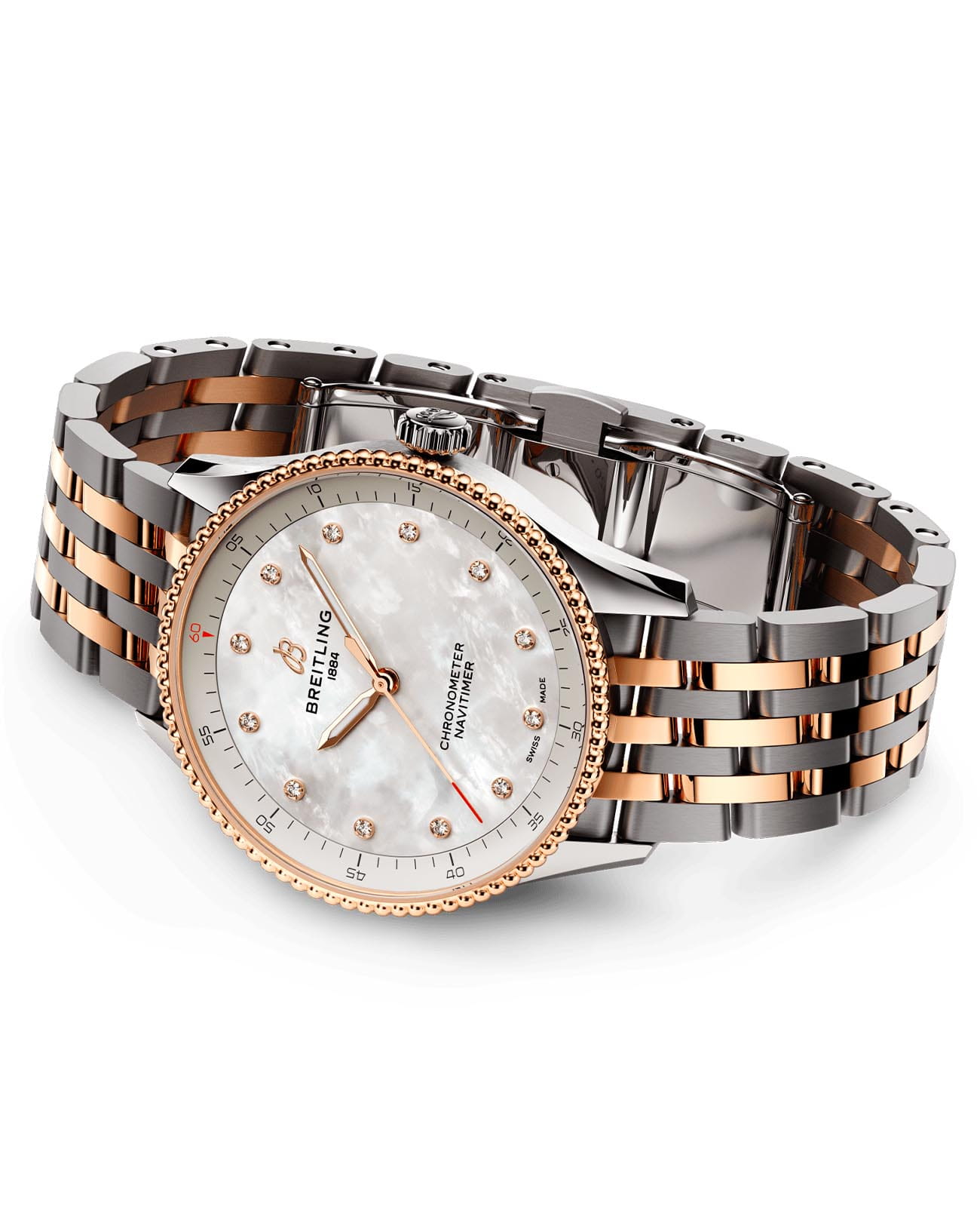 Швейцарские унисекс часы-хронометр Breitling Navitimer Automatic 32 U77320E61A1U1, механический механизм (автоматический калибр) с высокой точностью. Сапфировое стеклоСапфировое стеклоПрочный и надёжный материал из кристалла сапфира синтетического происхождения, характеризующийся особой твёрдостью и устойчивостью к царапинам и повреждениям. устойчивое к появлению царапин, обладающее высокой прозрачностью. Класс водозащиты: 50 метров, позволит защитить корпус от случайных брызг или капель дождя. Корпус часов изготовлен из нержавеющей стали. Браслет из стали и красного 18-каратного золота18-каратное золотоОбозначение по каратной системе пробирования, оно показывает, сколько драгоценного металла содержится в изделии. 18 карат - в составе 75% чистого золота, соответствует 750 пробе.