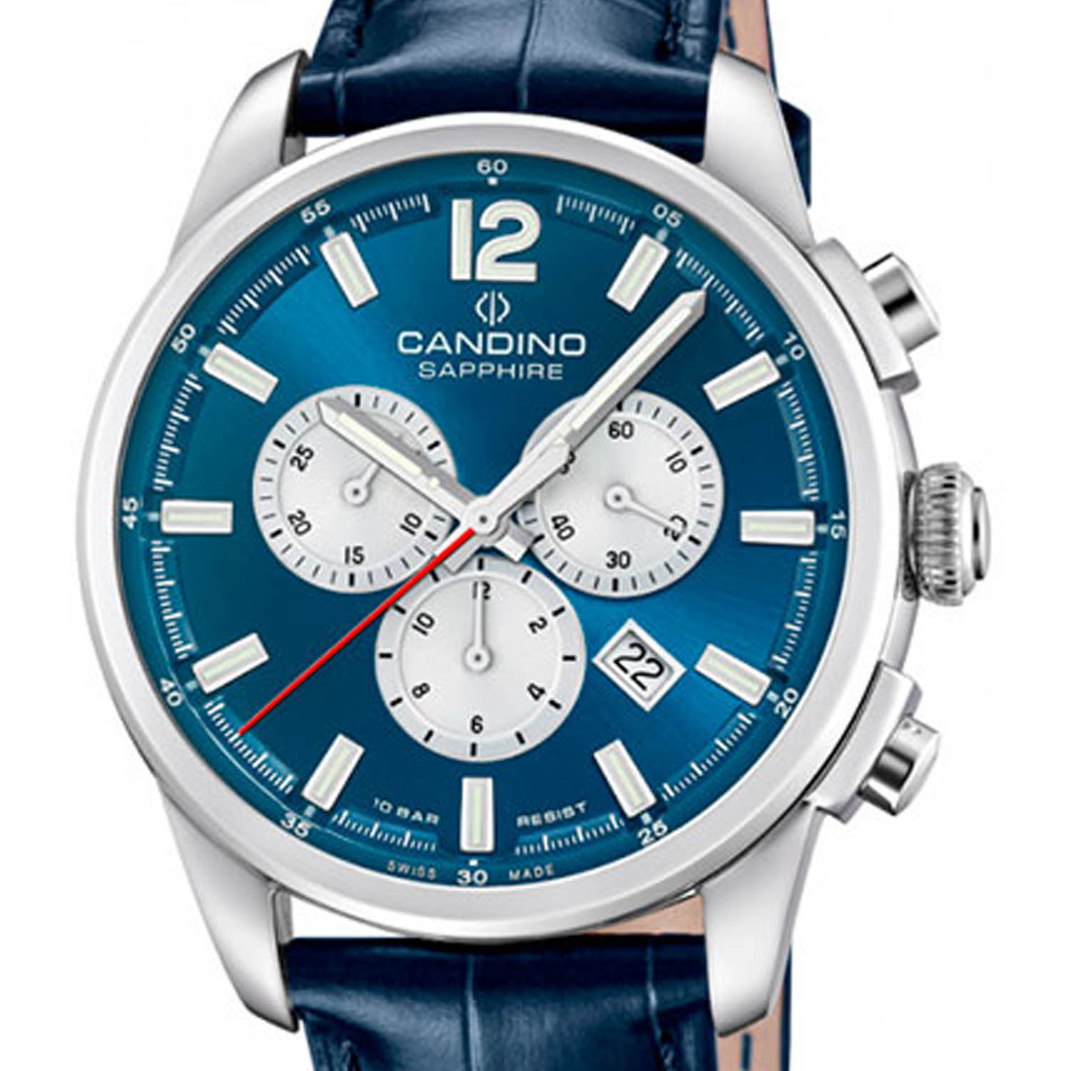 Швейцарские мужские наручные часы-хронографХронографФункция позволяет измерять отрезки времени с особой точностью: часы, минуты, секунды. Верным признаком хронографа является наличие на циферблате 3 дополнительных окошек-счётчиков. Candino Chronograph C4745/5, кварцевый механизм с высокой точностью. Сапфировое стеклоСапфировое стеклоПрочный и надёжный материал из кристалла сапфира синтетического происхождения, характеризующийся особой твёрдостью и устойчивостью к царапинам и повреждениям. устойчивое к появлению царапин, обладающее высокой прозрачностью. Часы, минуты, секунды. Индикация даты. Класс водозащиты: 100 метров, позволит плавать, нырять и заниматься другими водными видами спорта. Корпус часов изготовлен из нержавеющей стали. Стрелки и метки с люминесцентным покрытиемЛюминесцентное покрытиеПозволяет считывать показания времени в темноте. Производители наносят на стрелки, часовые индексы, безель или поверхность циферблата светонакопительный состав, дающий холодное свечение..