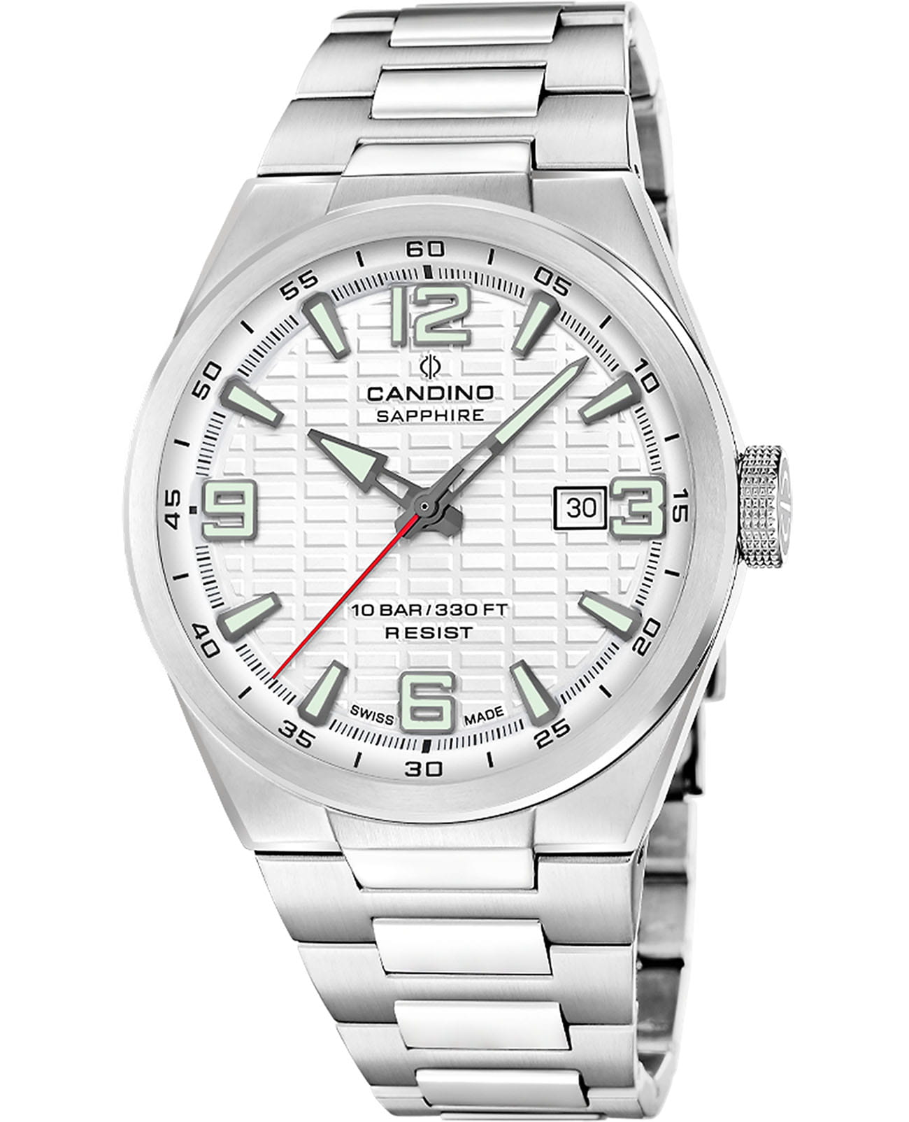 Мужские кварцевые часы Candino из коллекции Series 1947 — это сочетание классического дизайна, надёжности и швейцарского качества. Корпус диаметром 43 мм выполнен из нержавеющей стали. Циферблат белого цвета оформлен индексами и стрелками с люминесцентным покрытиемЛюминесцентное покрытиеПозволяет считывать показания времени в темноте. Производители наносят на стрелки, часовые индексы, безель или поверхность циферблата светонакопительный состав, дающий холодное свечение.. Окошко даты расположено в положении 3 часов. Циферблат защищён сапфировым стекломСапфировое стеклоПрочный и надёжный материал из кристалла сапфира синтетического происхождения, характеризующийся особой твёрдостью и устойчивостью к царапинам и повреждениям., устойчивым к царапинам. Механизм — кварцевый, обеспечивает высокую точность хода. Часы оснащены стальным браслетом с раскладной застёжкойРаскладная застёжкаТакой тип застёжки используется только на браслетах из металла. Она никогда не раскрывается полностью, происходит разделение на 2 и более частей. Раскладывающая застёжка снизит вероятность потери часов к минимуму.. Водонепроницаемость 100 м позволяет использовать часы для плавания и повседневного ношения. Гарантия — 2 года. Идеальный выбор для тех, кто ценит стиль, точность и надёжность.