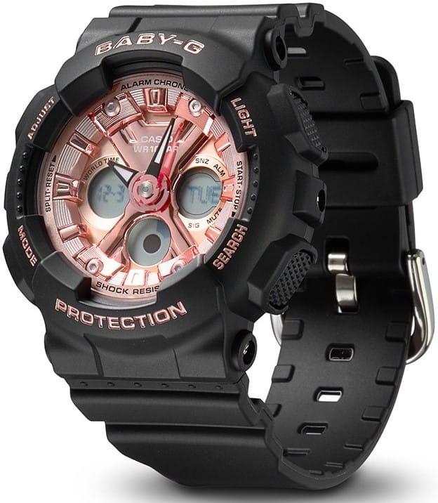 Оригинальный фактурный циферблат выполнен в сияющем розовом оттенке, гармонирующий с общим чёрным матовым исполнением. Ударопрочный корпусУдаропрочный корпусМеханизм заключён в корпус, выполненный из современных материалов, устойчивых к ударам, механическим повреждениям и падению с высоты: инновационный пластик, карбон, нержавеющая сталь, титан. сделан из полимерного пластика, поглощающего удары и вибрацию, конструкция не пропускает воду и выдерживает падения с высоты. Кварцевый механизм с высокой точностью хода. Минеральное стеклоМинеральное стеклоМинеральное стекло представляет собой искусственно выращенный минерал кварца. Такое стекло отличается особой устойчивостью к повреждениям и царапинам. Уступает по некоторым качествам сапфировому стеклу. устойчивое к мелким механическим повреждениям. Светодиодная подсветкаСветодиодная подсветкаСветодиодная или LED-подсветка обеспечивает появление яркого холодного свечения за счёт LED-элементов - маленьких лампочек. Они потребляют минимальное количество энергии, чаще всего можно встретить 1 светодиод, в нижней части циферблата. циферблата. БудильникБудильникБуди́льник — часы, в заданный момент времени подающие звуковой, световой и/или в редких случаях другой сигнал. с функцией повтора, таймерТаймерОтсчитывает секунды в обратном направлении в заданном интервале времени., мировое времяМировое время Полезное часовое усложнение, отображающее время в основных городах и известных областях по всему миру, оно связано с часовыми поясами, удобно для путешественников и бизнесменов. , секундомерСекундомерСекундоме́р — прибор, способный измерять интервалы времени с точностью до долей секунды., автоматический календарь. Габариты: 46,3 x 43,4 x 15,8 мм.