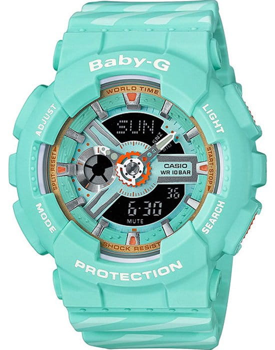Привлекательная модель относится к специальной линейке Baby-G «Chance», созданной под руководством миланского дизайнерского бюро Punto it design. Аксессуар в мятном оттенке с линеарным принтом на полимерном ремешке наделён ударопрочным корпусомУдаропрочный корпусМеханизм заключён в корпус, выполненный из современных материалов, устойчивых к ударам, механическим повреждениям и падению с высоты: инновационный пластик, карбон, нержавеющая сталь, титан. из пластика, выдерживающего удары и повреждения. Японский кварцевый механизм. Срок службы батарейки - 2 года. Минеральное стекло. Светодиодная подсветкаСветодиодная подсветкаСветодиодная или LED-подсветка обеспечивает появление яркого холодного свечения за счёт LED-элементов - маленьких лампочек. Они потребляют минимальное количество энергии, чаще всего можно встретить 1 светодиод, в нижней части циферблата. циферблата. Включение и отключение звука кнопок. Водонепроницаемость до 10 бар. Функция мирового времениМировое время Полезное часовое усложнение, отображающее время в основных городах и известных областях по всему миру, оно связано с часовыми поясами, удобно для путешественников и бизнесменов. , 5 будильников, секундомер, таймер, хронографХронографФункция позволяет измерять отрезки времени с особой точностью: часы, минуты, секунды. Верным признаком хронографа является наличие на циферблате 3 дополнительных окошек-счётчиков., календарь. Габариты: 46,3 x 43,4 x 15,8 мм.