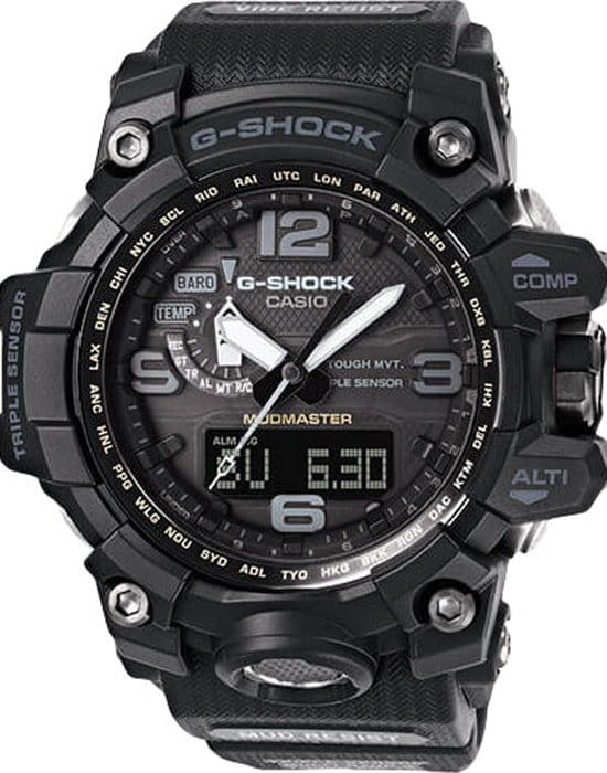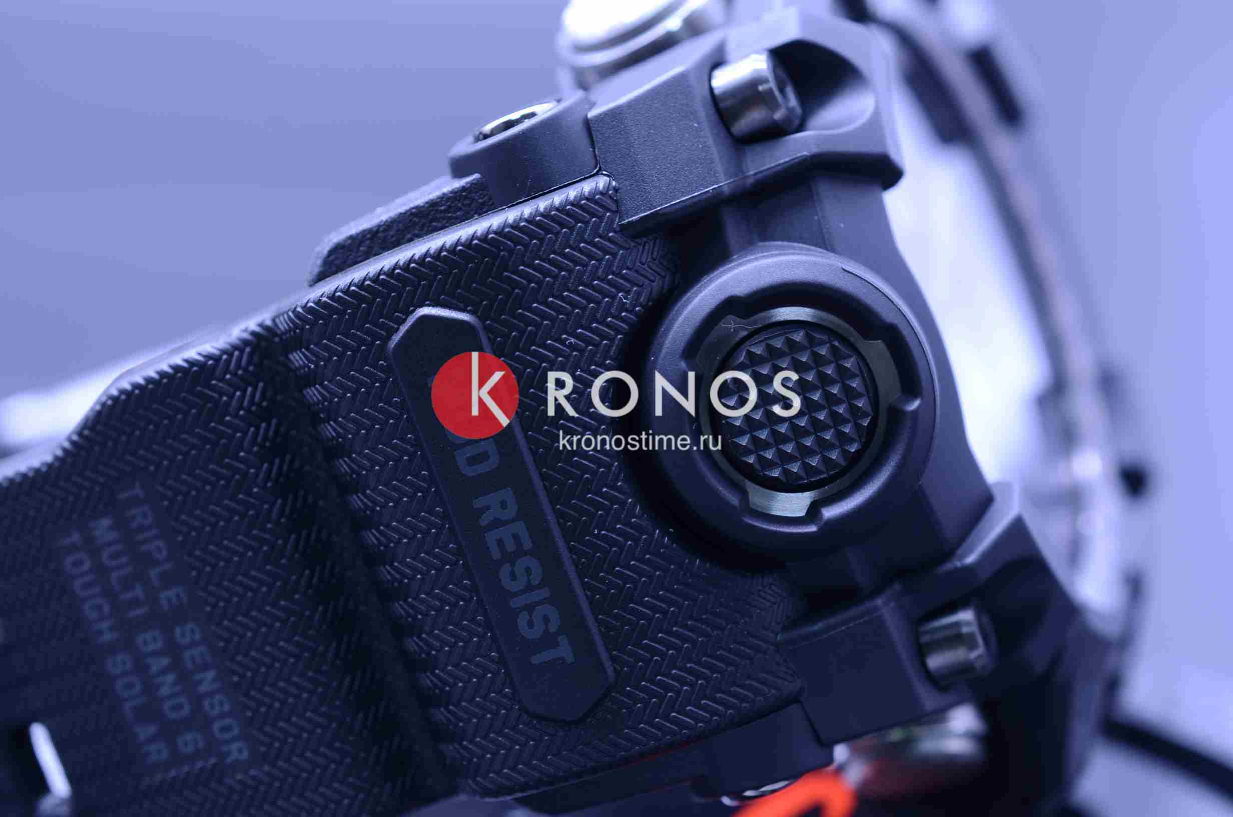 Наручные часы серии Mudmaster в лаконичном чёрном исполнении привлекают брутальным дизайном с внушительным ударопрочным корпусомУдаропрочный корпусМеханизм заключён в корпус, выполненный из современных материалов, устойчивых к ударам, механическим повреждениям и падению с высоты: инновационный пластик, карбон, нержавеющая сталь, титан.. Они выполнены в стиле милитари, сочетая в себе узнаваемое оформление, прочные материалы и современные технологии. Привлекательно смотрится полимерный ремешок с фактурной поверхностью, обеспечивающий комфортное ношение. Циферблат защищает сапфировое стекло с антибликовым покрытием, устойчивое к возникновению царапин. Корпус из высококачественного пластика. Двойная электролюминесцентная подсветкаЭлектролюминесцентная подсветкаЭлектролюминесцентная панель устанавливается под ЖК-экраном часов, при нажатии кнопки электричество преобразуется в свет за счёт подачи напряжения на атомы фосфора, такой тип подсветки позволяет освещать весь циферблат.. Питание от солнечной батареи . Индикатор заряда батарейки. Закаленное минеральное стекло. Устойчивость к грязи и пыли. Включение и выключение звука кнопок. Функции: цифровой компас, барометр, термометр от -10° С до +60°С, UTCUTCВсемирное кординационное время, не имеющее привязки к географическому положению Гринвича, основывается на атомном отсчёте времени. Регулировка времени осуществляется более точно, чем устаревшее GMT.