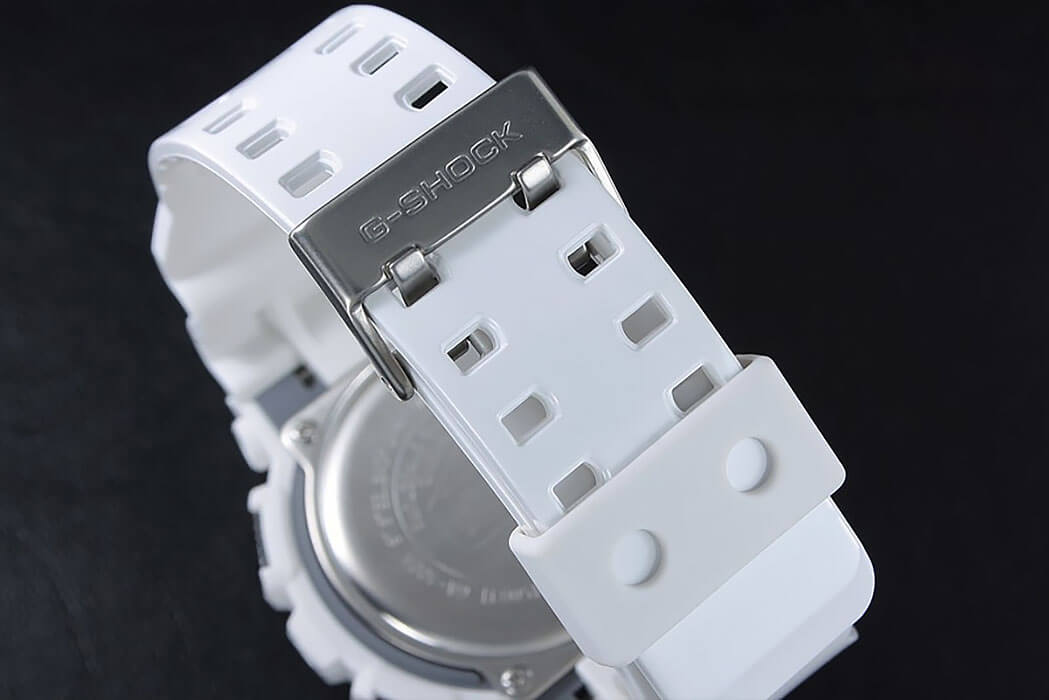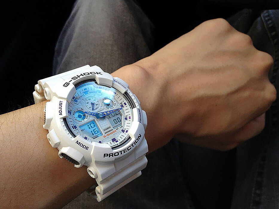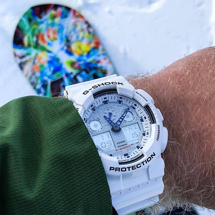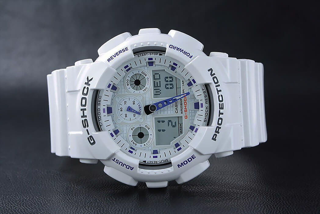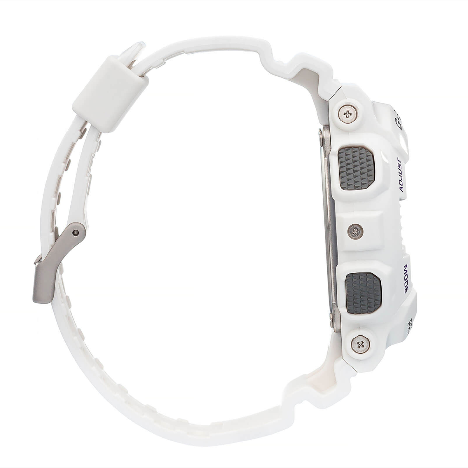 Наручные часы с массивным белым противоударным корпусомУдаропрочный корпусМеханизм заключён в корпус, выполненный из современных материалов, устойчивых к ударам, механическим повреждениям и падению с высоты: инновационный пластик, карбон, нержавеющая сталь, титан. стойко противостоят повреждениям, вибрации, падению с высоты. Стильно смотрятся синие детали и перфорированные стрелки, формируя динамичный дизайн. Японский кварцевый калибр с точностью хода +/- 15 секунд в месяц. Батарейка рассчитана на 2 года службы. Надёжный и комфортный ремешок из полимерного материала. Минеральное стекло. Яркая светодиодная подсветкаСветодиодная подсветкаСветодиодная или LED-подсветка обеспечивает появление яркого холодного свечения за счёт LED-элементов - маленьких лампочек. Они потребляют минимальное количество энергии, чаще всего можно встретить 1 светодиод, в нижней части циферблата. циферблата. 12/24-х часовое отображение времени. Устойчивость к негативному воздействию магнитного поля. Расчёт скорости по указанной дистанции. Водонепроницаемость 200 метров. Таймер обратного отсчёта, 5 будильников, автоматический календарь, мировое времяМировое время Полезное часовое усложнение, отображающее время в основных городах и известных областях по всему миру, оно связано с часовыми поясами, удобно для путешественников и бизнесменов. , секундомер, хронографХронографФункция позволяет измерять отрезки времени с особой точностью: часы, минуты, секунды. Верным признаком хронографа является наличие на циферблате 3 дополнительных окошек-счётчиков.. Габариты: 55 x 51,2 x 16,9 мм.