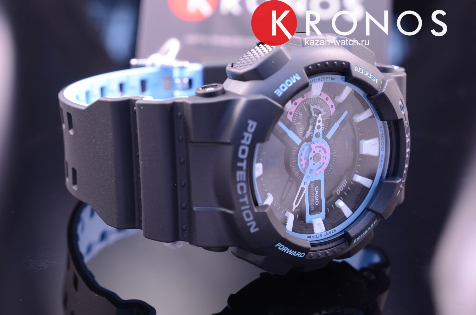 Элементы оформления напоминает лазерные и световые эффекты, без которых не обходятся концерты и ночные клубы. Оригинально смотрится двухцветный ремешок с внутренней стороной голубого цвета. Многоуровневый циферблат защищает закаленное минеральное стекло, устойчивое к царапинам. Японский кварцевый механизм получает питание от аккумулятора, срок службы которого составляет 2 года. Противоударный корпусУдаропрочный корпусМеханизм заключён в корпус, выполненный из современных материалов, устойчивых к ударам, механическим повреждениям и падению с высоты: инновационный пластик, карбон, нержавеющая сталь, титан. из полимерного пластика. Водонепроницаемость 20 бар. Устранение влияния магнитного поля. Светодиодная подсветкаСветодиодная подсветкаСветодиодная или LED-подсветка обеспечивает появление яркого холодного свечения за счёт LED-элементов - маленьких лампочек. Они потребляют минимальное количество энергии, чаще всего можно встретить 1 светодиод, в нижней части циферблата.. Секундомер, хронографХронографФункция позволяет измерять отрезки времени с особой точностью: часы, минуты, секунды. Верным признаком хронографа является наличие на циферблате 3 дополнительных окошек-счётчиков., расчёт средней скорости пройденного пути, календарь до 2099 года, мировое времяМировое время Полезное часовое усложнение, отображающее время в основных городах и известных областях по всему миру, оно связано с часовыми поясами, удобно для путешественников и бизнесменов. , таймер, будильник. Габариты: 55 x 51,2 x 16,9 мм.