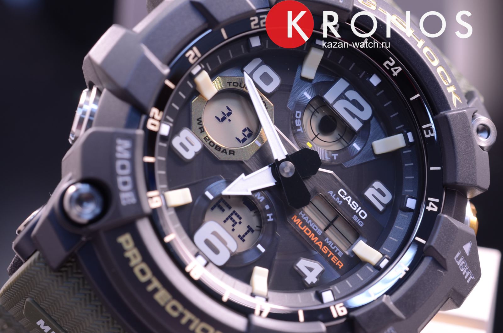 Наручные часы относятся к линейке Mudmaster, массивная модель с крупными деталями на вашем запястье точно не останется незамеченной. Ключевой особенностью стал герметичный ударопрочный корпусУдаропрочный корпусМеханизм заключён в корпус, выполненный из современных материалов, устойчивых к ударам, механическим повреждениям и падению с высоты: инновационный пластик, карбон, нержавеющая сталь, титан., способный препятствовать попаданию внутрь пыли, песка и грязи. Также ему не страшны вибрации, падение и удары. Это часы на солнечной батарее с технологией , время работы батарейки без подзарядки составляет 7 месяцев. Специальный индикатор позволяет следить за уровнем зарядки. Минеральное стекло. Двойная светодиодная подсветкаСветодиодная подсветкаСветодиодная или LED-подсветка обеспечивает появление яркого холодного свечения за счёт LED-элементов - маленьких лампочек. Они потребляют минимальное количество энергии, чаще всего можно встретить 1 светодиод, в нижней части циферблата. ЖК-дисплея и циферблата. Удобный полимерный ремешок защитного цвета хаки. Стрелки с люминесцентной подсветкойЛюминесцентное покрытиеПозволяет считывать показания времени в темноте. Производители наносят на стрелки, часовые индексы, безель или поверхность циферблата светонакопительный состав, дающий холодное свечение.. Водостойкость 20 бар. Коррекция времени по радиосигналу, функция мирового времениМировое время Полезное часовое усложнение, отображающее время в основных городах и известных областях по всему миру, оно связано с часовыми поясами, удобно для путешественников и бизнесменов. , автоматический календарь, будильник, таймер, секундомер. Габариты: 56,2 x 54,9 x 17,3 мм.