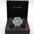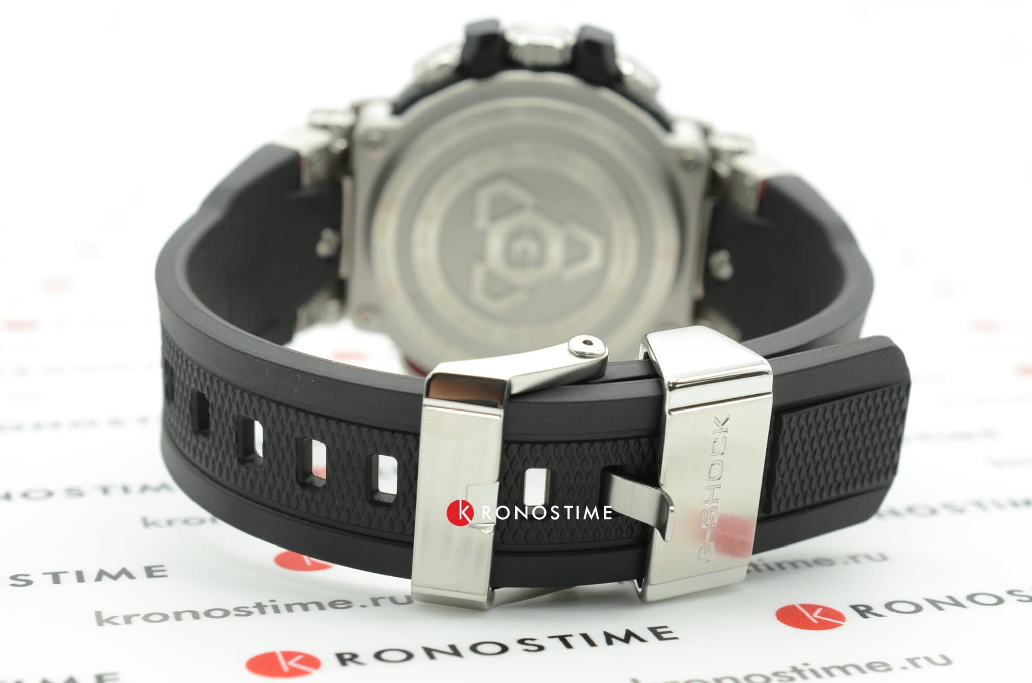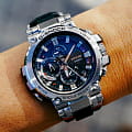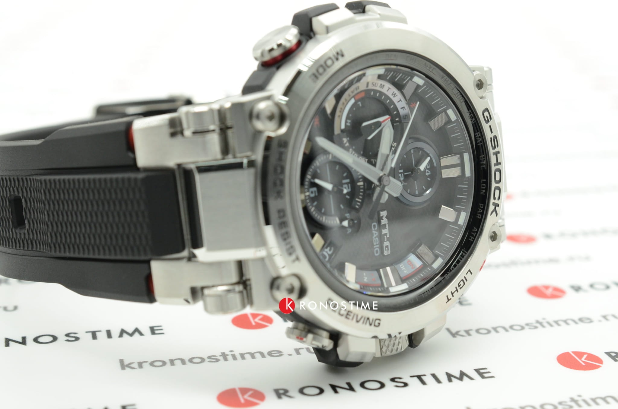 Компактный тёмный циферблат с узором в виде ромбиков стал идеальным решением для массивного стального безеляБезельВнешний ободок, закрепляющий стекло. В спортивных часах так называется поворотное кольцо с делениями на циферблате, выполняет роль таймера – замеряет отрезки времени на шкале. Неподвижный безель – элемент декора. Однонаправленно вращающийся безель на дайверских часах позволяет фиксировать моменты погружения и выныривания на поверхность.. Наручные часы MTG-B1000 выдерживают любые нагрузки благодаря особой конструкции. Ударопрочный корпусУдаропрочный корпусМеханизм заключён в корпус, выполненный из современных материалов, устойчивых к ударам, механическим повреждениям и падению с высоты: инновационный пластик, карбон, нержавеющая сталь, титан. сделан из нержавеющей стали и полимерного материала, дополнительное усиление происходит за счёт карбоновых волокон и геля Alpha Gel®, призванного защищать от негативного воздействия вибрации и температурных перепадов. Модель обладает технологией , заряжаясь от солнечного света. Индикатор состояния аккумулятора. Сферическое сапфировое стекло с антибликовой обработкой. Коррекция текущего времени радиосигналом. Bluetooth-синхронизация со смартфономBluetoothСовременная технология, позволяющая синхронизировать часы с телефоном и переносить данные. Часы с Bluetooth расширяют возможности вашего смартфона и делают его использование ещё более удобным.. Водонепроницаемость 20 бар. ЛюминесцентнаяЛюминесцентное покрытиеПозволяет считывать показания времени в темноте. Производители наносят на стрелки, часовые индексы, безель или поверхность циферблата светонакопительный состав, дающий холодное свечение. и светодиодная подсветкаСветодиодная подсветкаСветодиодная или LED-подсветка обеспечивает появление яркого холодного свечения за счёт LED-элементов - маленьких лампочек. Они потребляют минимальное количество энергии, чаще всего можно встретить 1 светодиод, в нижней части циферблата.. Возможности: таймер, будильник, мировое времяМировое время Полезное часовое усложнение, отображающее время в основных городах и известных областях по всему миру, оно связано с часовыми поясами, удобно для путешественников и бизнесменов. , секундомер, календарь, UTCUTCВсемирное кординационное время, не имеющее привязки к географическому положению Гринвича, основывается на атомном отсчёте времени. Регулировка времени осуществляется более точно, чем устаревшее GMT.
