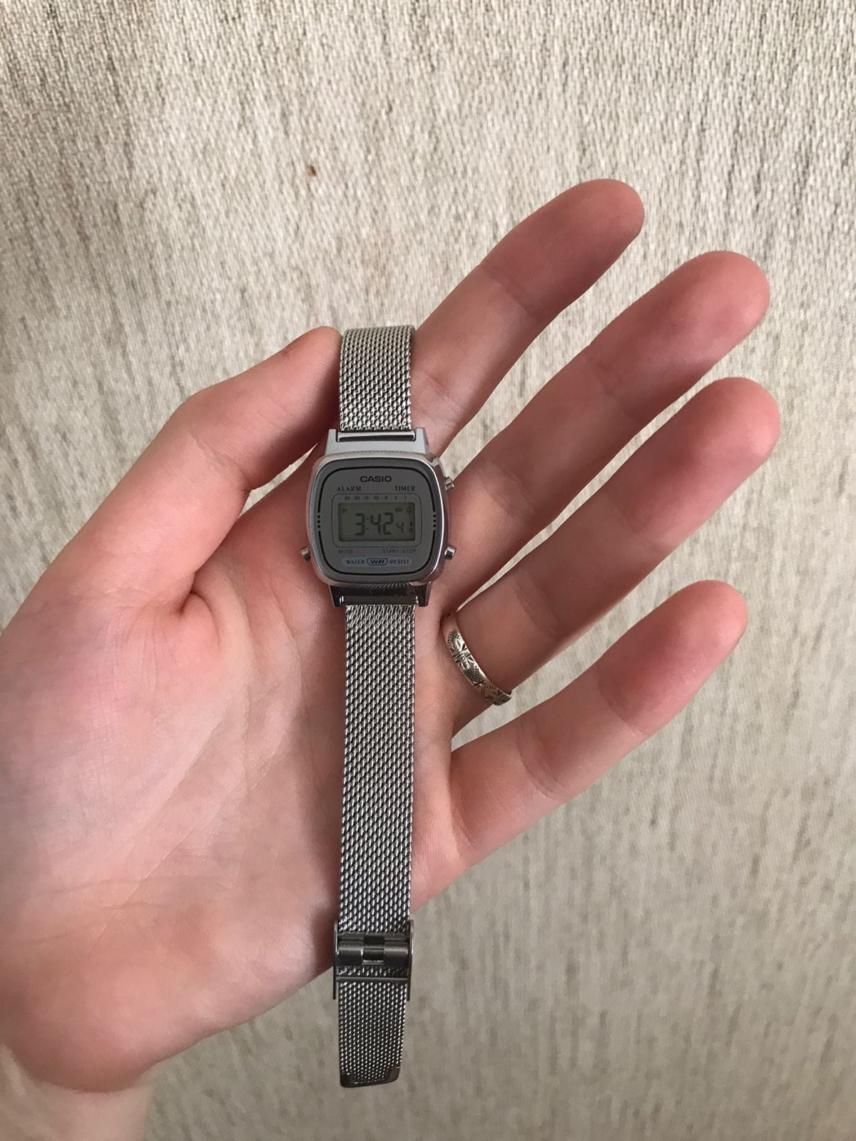 Из функционала есть таймер , секундомер , будильник, автоматический календарь. Застёжку можно легко отрегулировать по размеру руки. Эта модель является водонепроницаемой, устойчива к мелким брызгам.