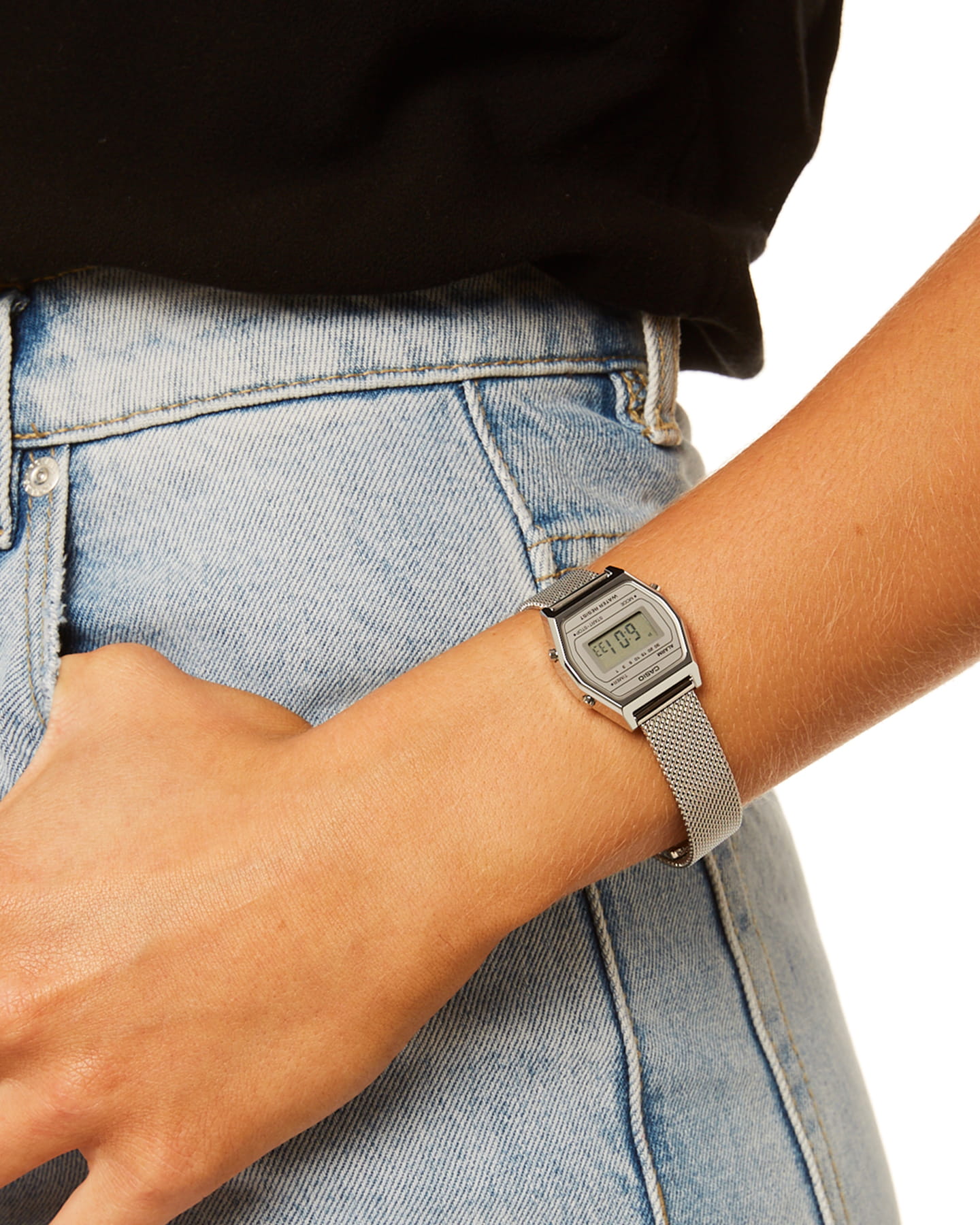 Спортивные женские наручные часы с электронным циферблатом. Оснащены функциями: секундомера, таймера, календаря и подсветки. Корпус - Нержавеющая сталь, PVD покрытие; Стекло - Пластик; Водозащита - 30 м. (WR 30); Материал ремешка - Нержавеющая сталь,покрытие; Цвет ремешка -Серый; Цвет циферблата - Lcd.