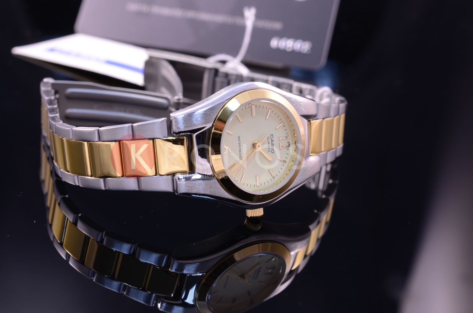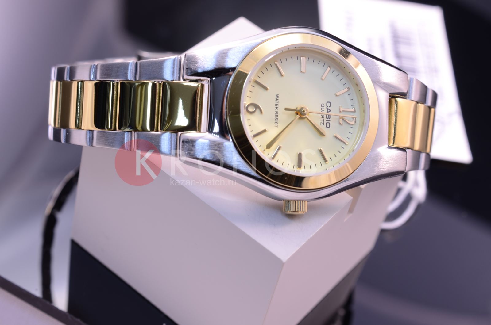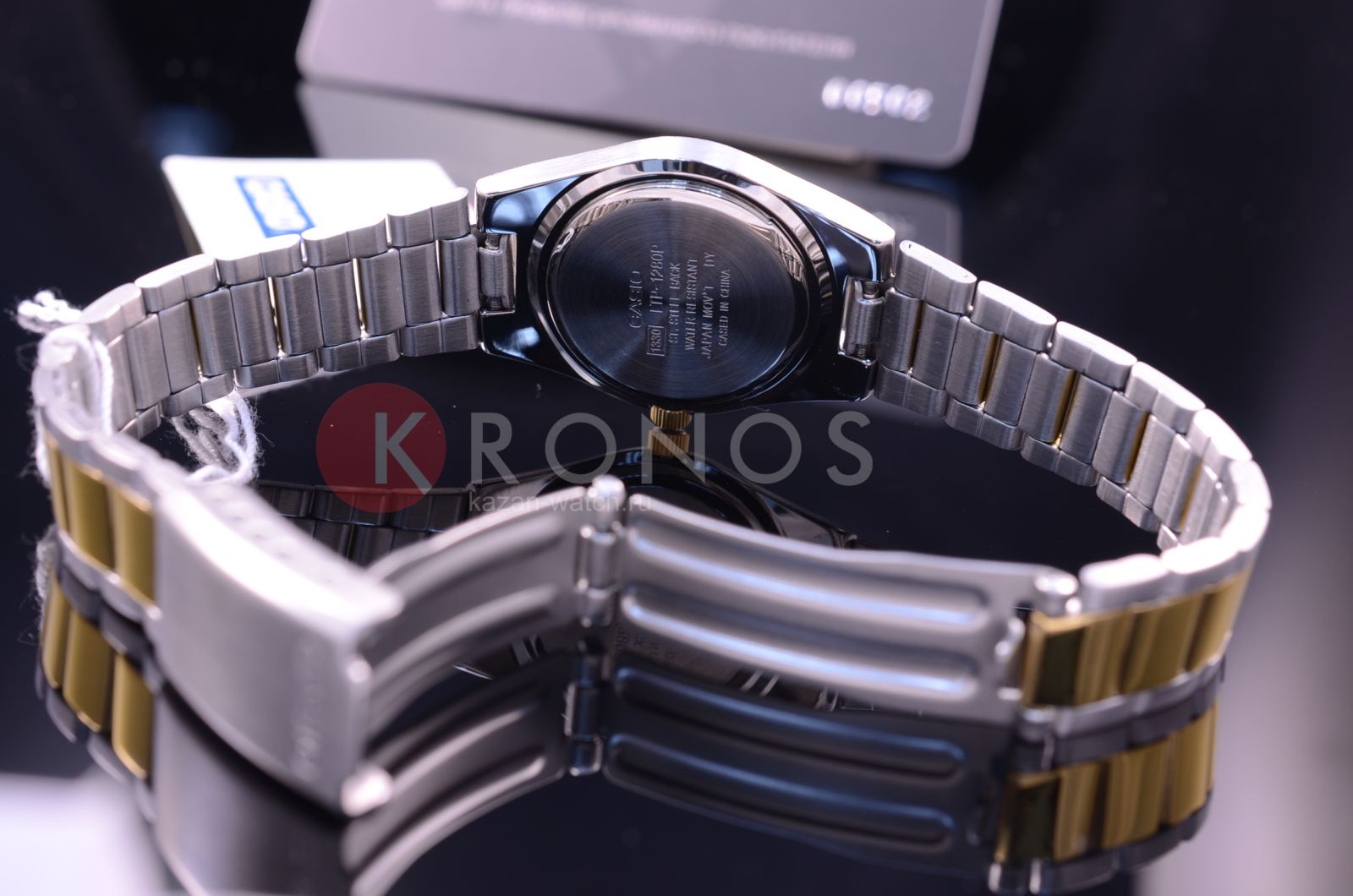 На поверхность наручных часов от Casio нанесено защитное IP-покрытиеIP-покрытиеМетод ионного напыления. Демонстрирует повышенную устойчивость к истиранию, окислению и химическим веществам. Под воздействием высокого давления и температуры около 1500°C молекулы металла надёжно соединяются с частицами корпуса часов.. Стальной корпус аксессуара сделан из нержавеющей стали. На круглом циферблате светло-золотистого цвета расположены аккуратные временные отметки в виде арабских цифр и штрихов. Двухцветный браслет сделан из нержавеющей стали. Часы надежно защищены минеральным стеклом. Вес аксессуара равен 52 граммам. Часы работают от батарейки со сроком службы в 3 года.