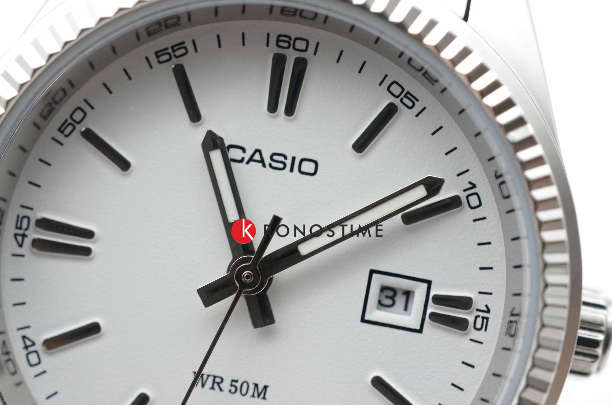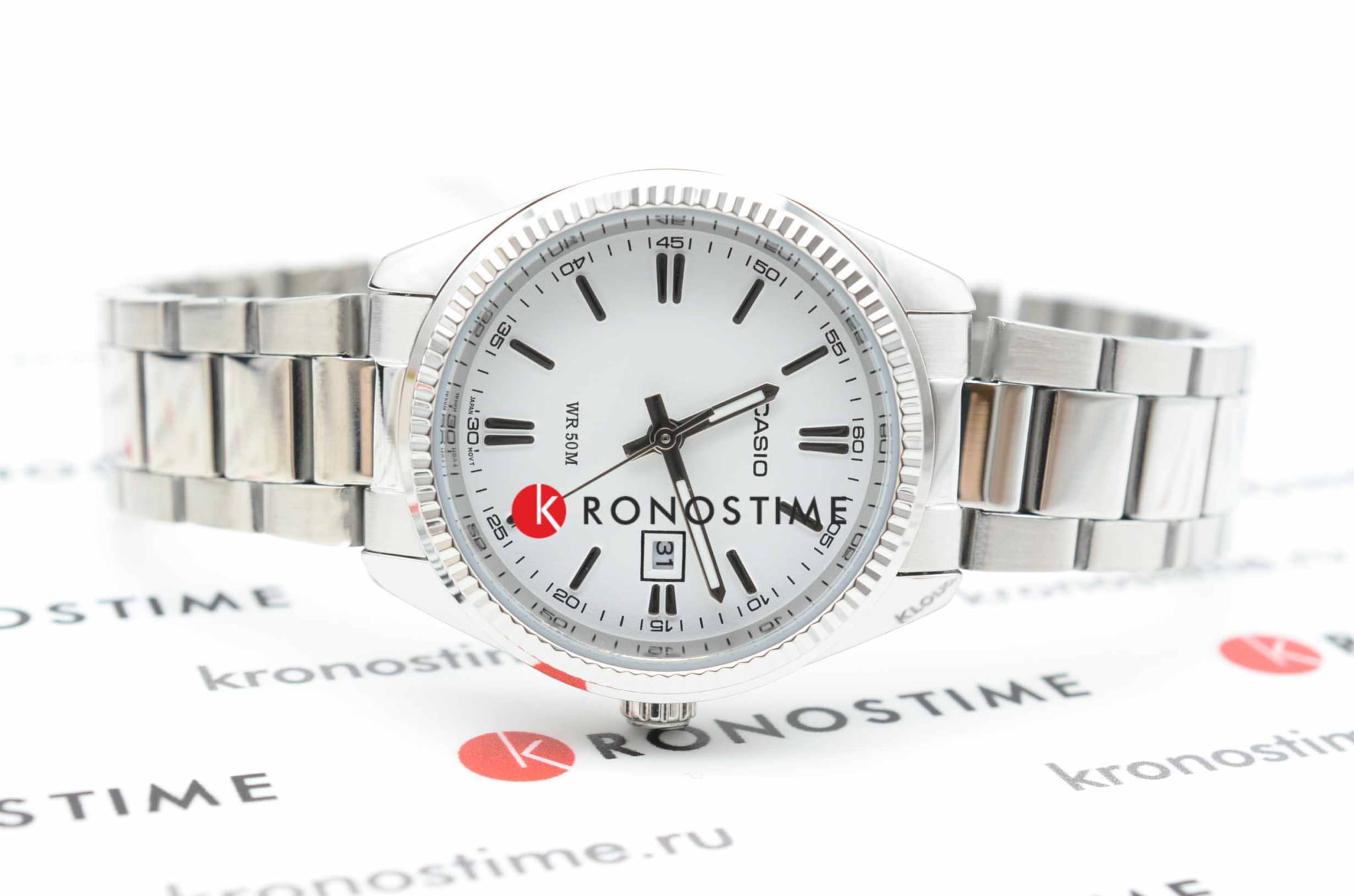 Цветовая расцветка наручных часов от Casio выдержана в сдержанных тонах. Корпус из гипоаллергенной латуни прочно закреплен с браслетом из нержавеющей стали. Застегиваются с помощью надежной раскладывающейся застежки. На круглом циферблате белого цвета расположены временные отметки в виде штрихов и арабских цифр. Часы защищены от повреждений минеральным стеклом. Водонепроницаемость равна 5 бар. Срок службы батарейки составляет 3 года. Вес часов равен 70 граммам.