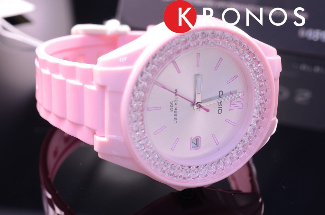 Корпус аккуратных и ярких наручных часов от Casio сделан из пластика. Яркий безельБезельВнешний ободок, закрепляющий стекло. В спортивных часах так называется поворотное кольцо с делениями на циферблате, выполняет роль таймера – замеряет отрезки времени на шкале. Неподвижный безель – элемент декора. Однонаправленно вращающийся безель на дайверских часах позволяет фиксировать моменты погружения и выныривания на поверхность. вокруг циферблата отражает падающий свет и добавляет аксессуару привлекательности. На круглом циферблате серебристого цвета расположены аккуратные римские цифры и штрихи. Благодаря кварцевому механизму отсутствует необходимость каждый раз заводить часы. Благодаря подсветке NeobriteПодсветка NeobriteИспользование светонакопительных составов на основе сульфида цинка или алюмината стронция, яркий свет можно наблюдать на протяжении 6-10 часов после «зарядки» часов около источника света. узнать информацию на циферблате легко даже в темное время суток. Водонепроницаемость составляет 50 WR.