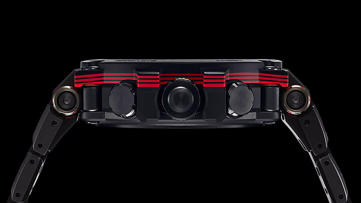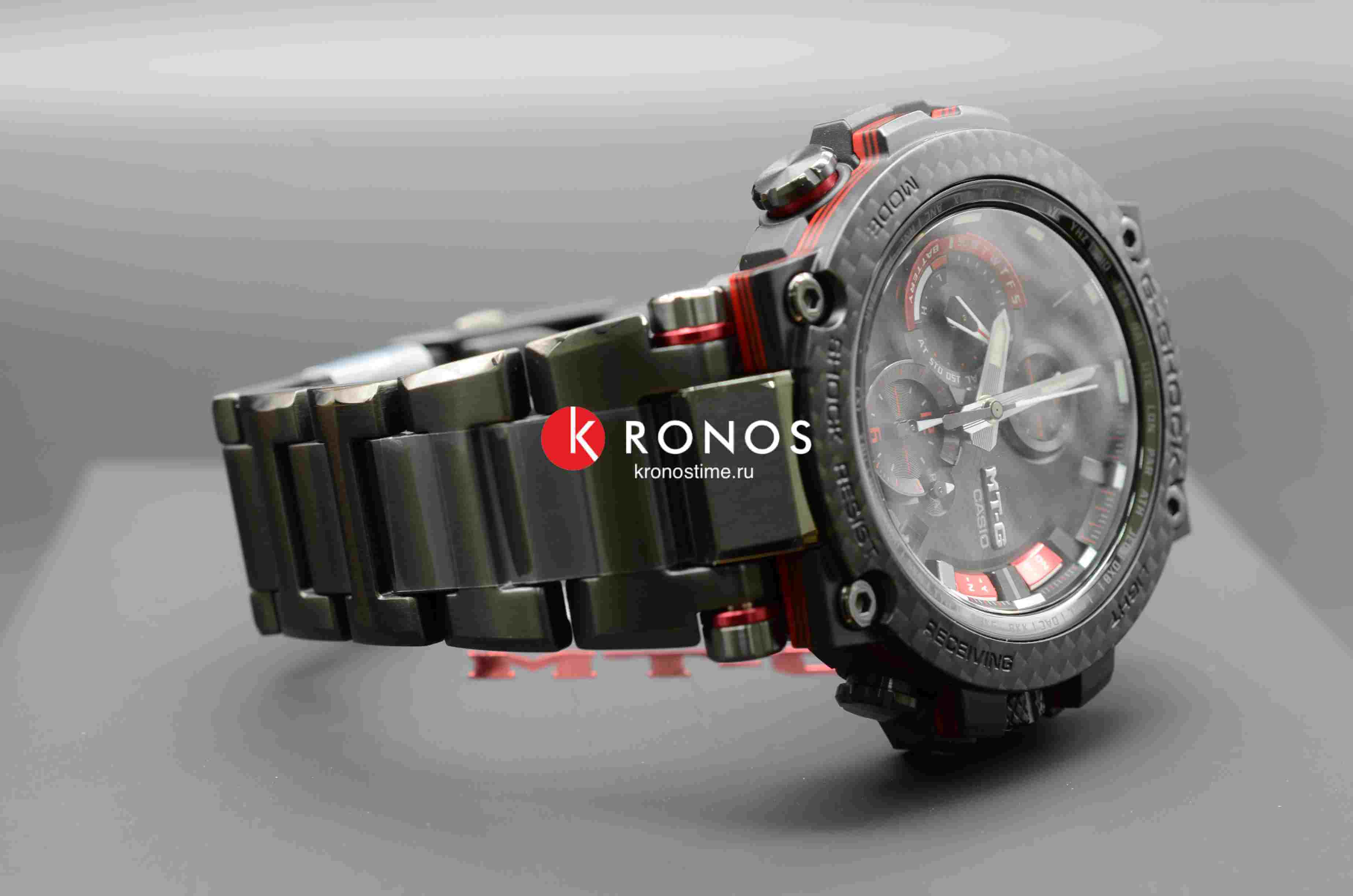 Чёрный циферблат с красными акцентами отличается необычной ромбовидной текстурой, внушительный карбоновый безель имеет шахматный узор. Casio обновили ударопрочный корпусУдаропрочный корпусМеханизм заключён в корпус, выполненный из современных материалов, устойчивых к ударам, механическим повреждениям и падению с высоты: инновационный пластик, карбон, нержавеющая сталь, титан., по сравнению с предыдущими моделями MTG он получился компактнее и тоньше (14,4 мм). Корпус выполнен из нержавеющей стали и пластика, усиленного карбоном - Carbon Core GuardCarbon Core Guard Новейшая структура корпуса, разработанная Casio. Полиуретановая пластина дополнительно усилена карбоновыми вставками, что придаёт специальную защиту от механических повреждений. Карбон отличается лёгкостью и прочностью.. Дополнительно внедрили вставки из материала alphaGEL, силиконовая прослойка обеспечивает возникновение амортизирующего эффекта. Чёрное IP-покрытиеIP-покрытиеМетод ионного напыления. Демонстрирует повышенную устойчивость к истиранию, окислению и химическим веществам. Под воздействием высокого давления и температуры около 1500°C молекулы металла надёжно соединяются с частицами корпуса часов.. Технология . Подсветка экрана. Стекло из сапфира. Функции: Bluetooth SmartBluetoothСовременная технология, позволяющая синхронизировать часы с телефоном и переносить данные. Часы с Bluetooth расширяют возможности вашего смартфона и делают его использование ещё более удобным., поиск телефона, будильник, приём радиосигнала, хронографХронографФункция позволяет измерять отрезки времени с особой точностью: часы, минуты, секунды. Верным признаком хронографа является наличие на циферблате 3 дополнительных окошек-счётчиков., календарь, мировое времяМировое время Полезное часовое усложнение, отображающее время в основных городах и известных областях по всему миру, оно связано с часовыми поясами, удобно для путешественников и бизнесменов. . Габариты: 51,7 x 55,8 x 14,4 мм.
