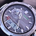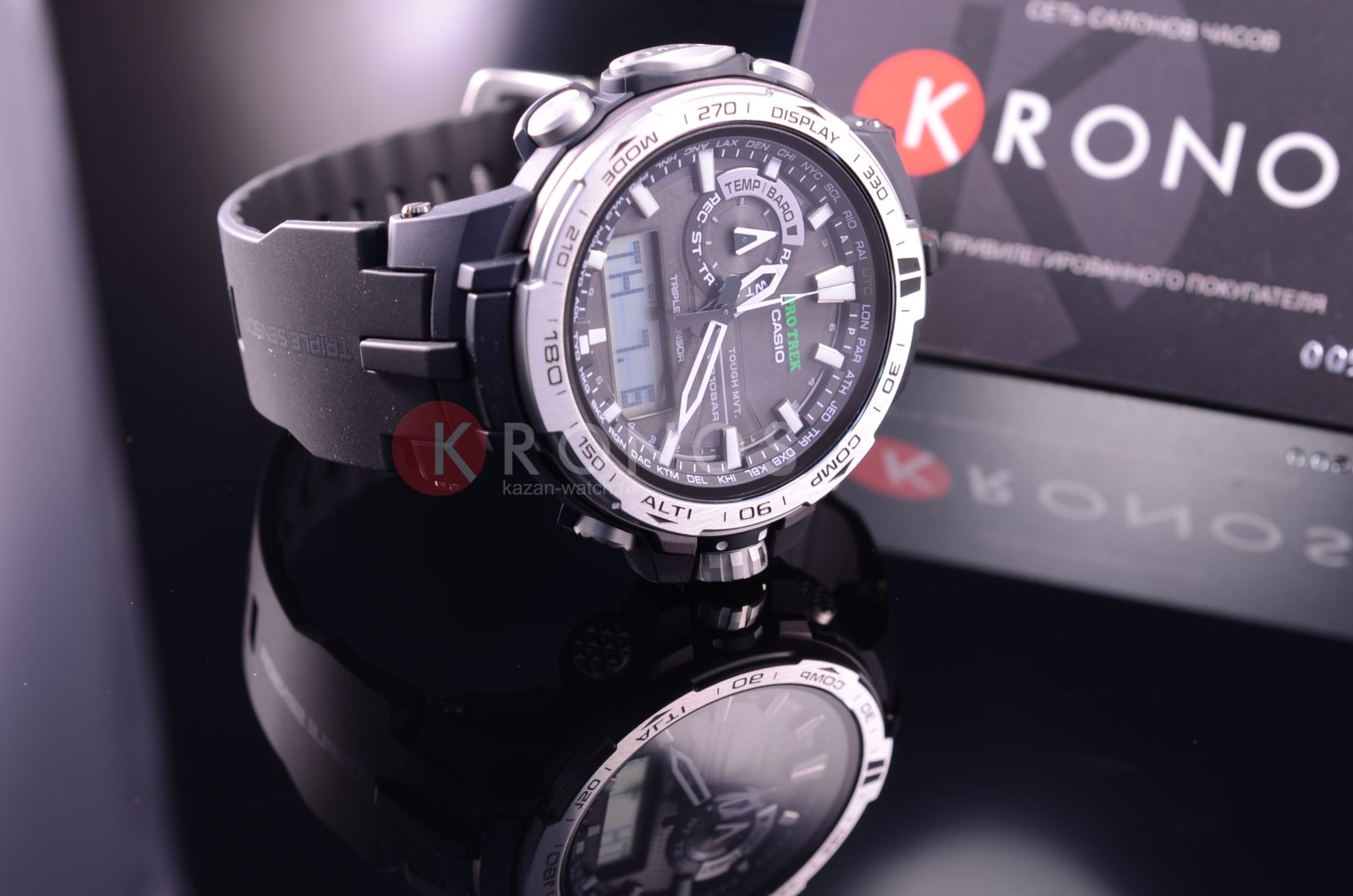 Часы, созданные для любителей активного отдыха. Питание от солнечной энергии Tough Solar - солнечные батарейки большой мощности, индикатор заряда батареи. Функция автоматического сохранения энергии. Модуль часов рассчитан на работу при низких температурах до -10°С/14°F. Прием радиосигнала (Европа, США, Япония, Китай). Технология Triple Sensor позволяет точно и легко определять сторону света, температуру и атмосферное давление. Термометр от -10° до +60°С с точностью 0,1°C. Барометр - измерение атмосферного давления от 260 до 1100 гПа (от 195 до 825 мм рт. ст.). Встроенный цифровой компас. Диапазон измерения от 0° до 359° с точностью 1°. Высотомер - встроенный датчик барометрического давления с возможностью вывода результатов в единицах высоты над уровнем моря (от -700 до 10000 метров). График набор высоты суммирует количество метров. Секундомер с точностью показаний 1/100с и временем измерения 24ч. Сплит-хронограф. Таймер обратного отсчета от 1мин до 1ч. Функция перемещения стрелок. Функция отключения/включения звука. Будильник (5 установок). Минеральное стекло устойчиво к появлению царапин. Водонепроницаемость (10 Бар).