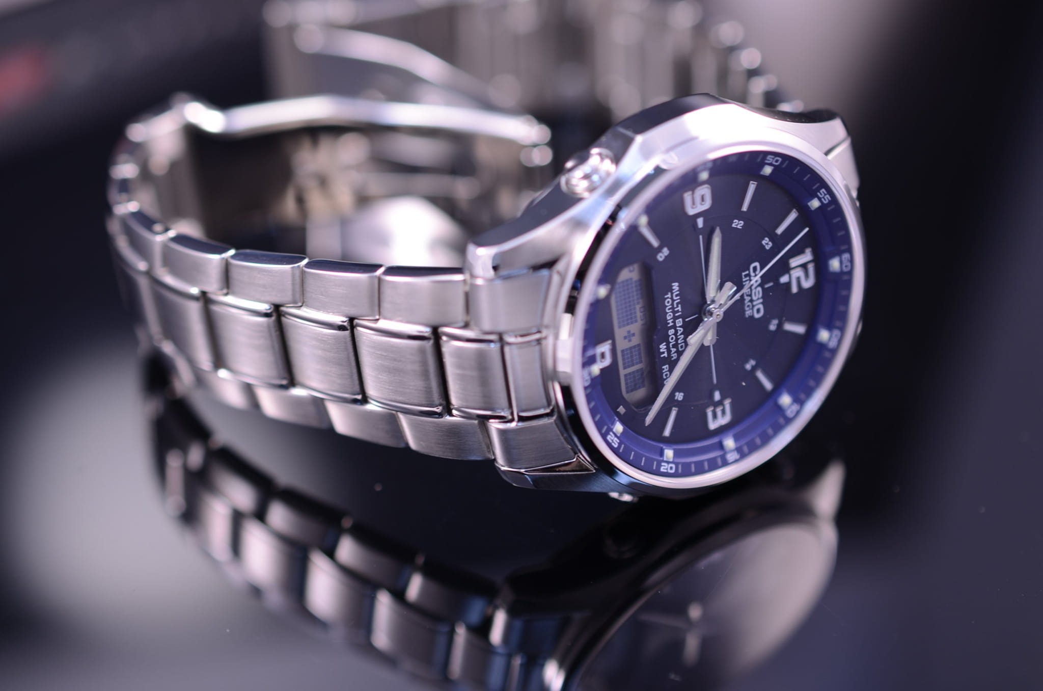 Высокотехнологичные японские наручные мужские часы. Круглый корпус и браслет часов выполнены из нержавеющей стали. Водонепроницаемость 10 ATM.  Круглый циферблат синего цвета. Часы оснащены такими функциями как секундомер, таймер обратного отсчета, будильник, мировое время, второй часовой пояс, прием радиосигнала. Сапфировое стекло не царапается.