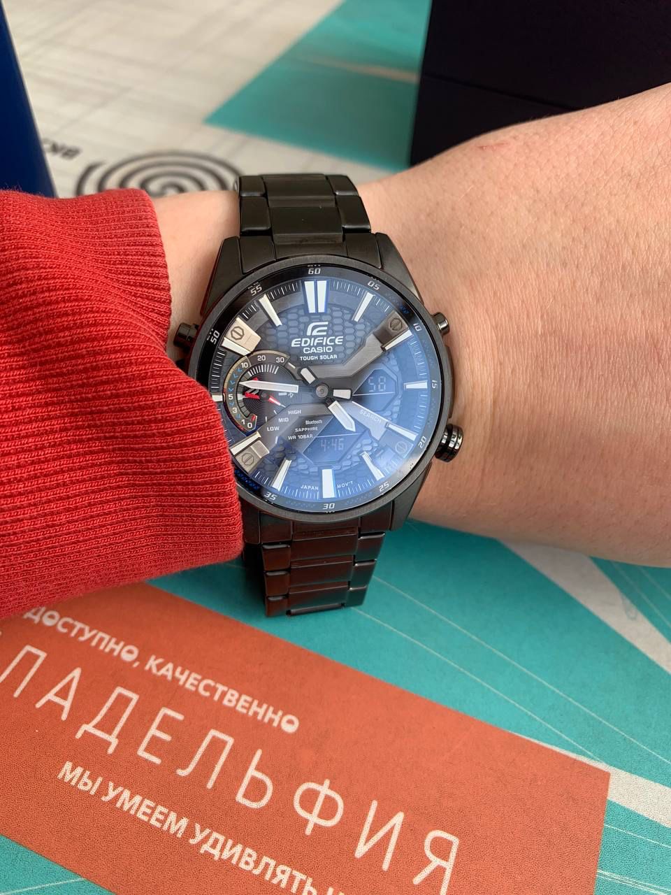 Достаточно внушительный черно-синий циферблат с оригинальным расположением счётчиков. Многофункциональная модель пригодится на любой случай жизни, ведь она оснащена Bluetooth 4.0BluetoothСовременная технология, позволяющая синхронизировать часы с телефоном и переносить данные. Часы с Bluetooth расширяют возможности вашего смартфона и делают его использование ещё более удобным., хронографомХронографФункция позволяет измерять отрезки времени с особой точностью: часы, минуты, секунды. Верным признаком хронографа является наличие на циферблате 3 дополнительных окошек-счётчиков., секундомером, тахиметромТахиметрРазмеченная шкала, располагается на ободке или безеле часов. Тахиметр позволяет рассчитать скорость на определённом участке пути, расстояние измеряется в километрах или милях., таймером, будильником, календарём, есть мировое времяМировое время Полезное часовое усложнение, отображающее время в основных городах и известных областях по всему миру, оно связано с часовыми поясами, удобно для путешественников и бизнесменов. и функция поиска телефона. Питание поступает от солнечной энергии - . Водонепроницаемость до 10 бар. Корпус, браслет, безельБезельВнешний ободок, закрепляющий стекло. В спортивных часах так называется поворотное кольцо с делениями на циферблате, выполняет роль таймера – замеряет отрезки времени на шкале. Неподвижный безель – элемент декора. Однонаправленно вращающийся безель на дайверских часах позволяет фиксировать моменты погружения и выныривания на поверхность. из нержавеющей стали. Минеральное стекло. Двойная светодиодная подсветкаСветодиодная подсветкаСветодиодная или LED-подсветка обеспечивает появление яркого холодного свечения за счёт LED-элементов - маленьких лампочек. Они потребляют минимальное количество энергии, чаще всего можно встретить 1 светодиод, в нижней части циферблата.. Габариты: 50 x 46 x 9,8 мм.